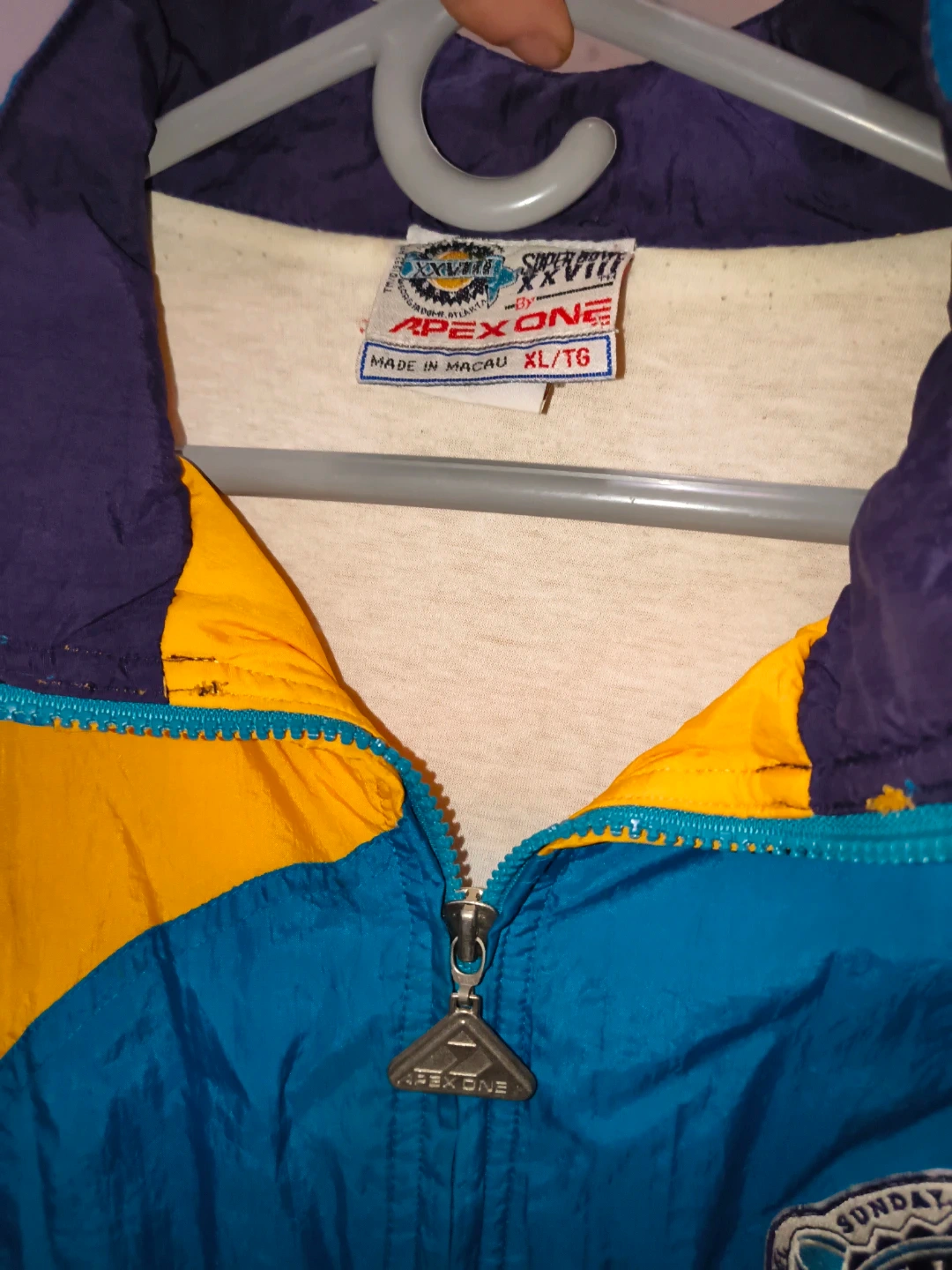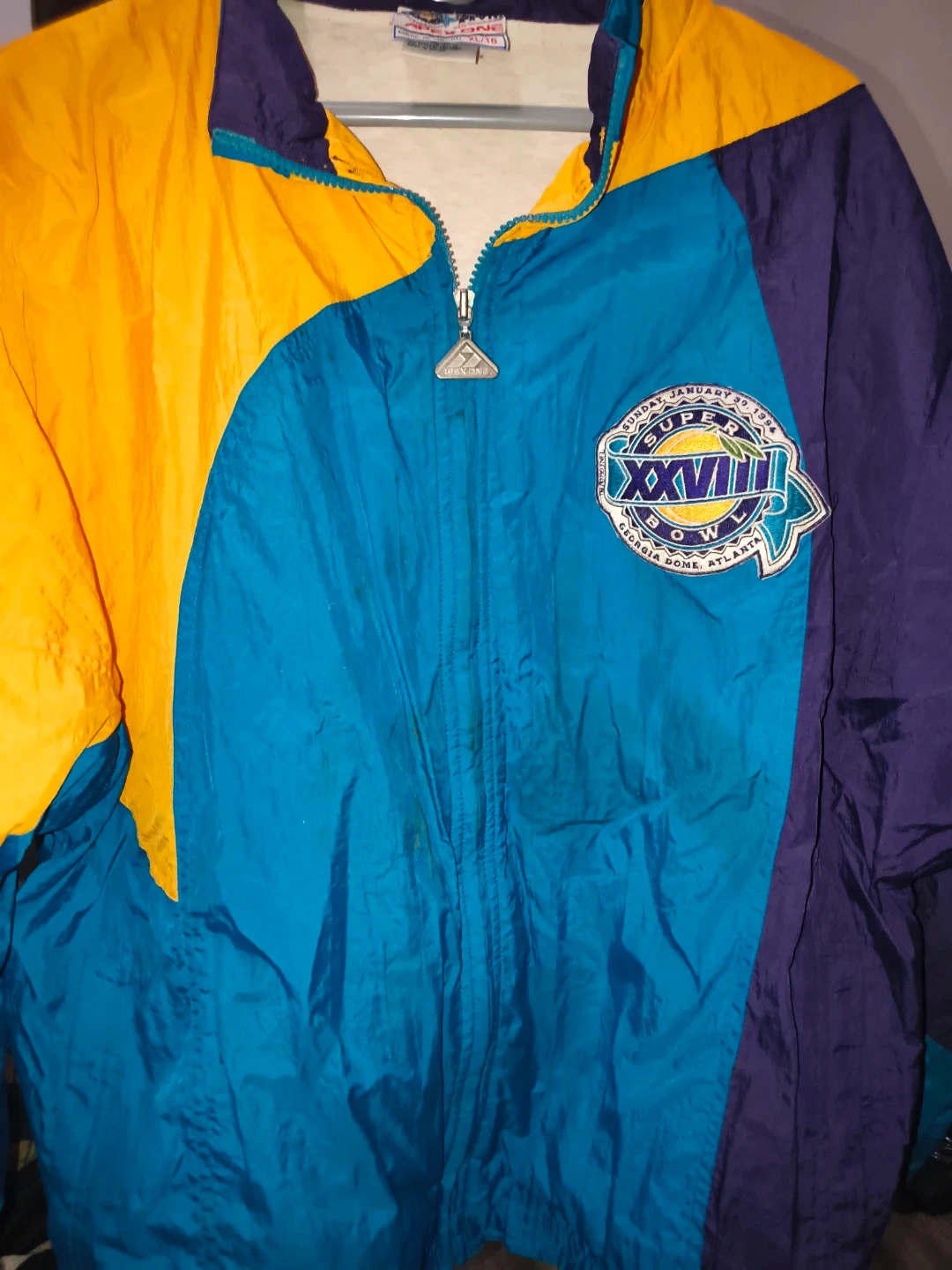 Authentic NFL jacket from Super Bowl XXVIII (Jan 30 1994). Apex One color-block vintage windbreaker size XL. Nice 90s look, patch logo, good condition. Perfect for collectors or retro wear.