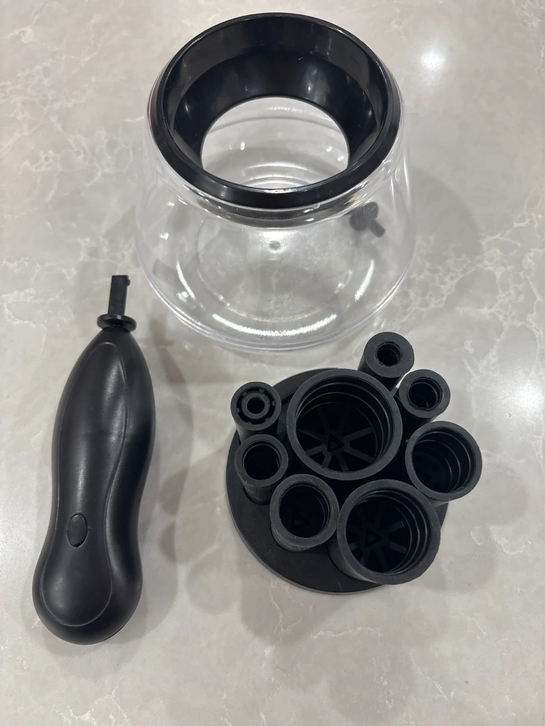 Clean your makeup brushes quickly with this automatic spinner cleaner. Includes a cleaning container, spinner attachment, and various brush holders. Plastic and rubber materials.