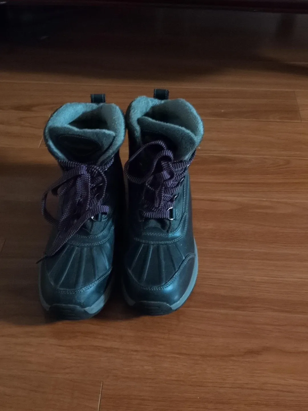 Waterproof winter boots with a warm, fleecy lining and lace-up closure. These boots are designed to keep your feet dry and toasty during cold weather. The durable construction offers good traction on slippery surfaces.