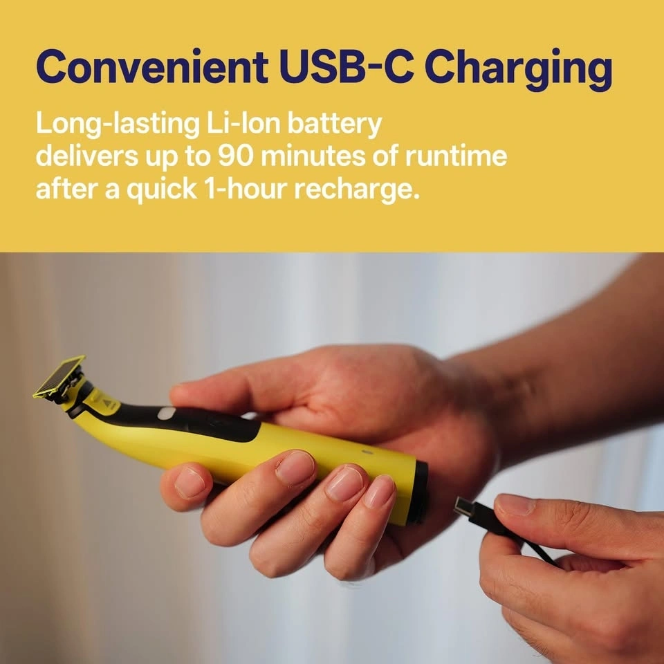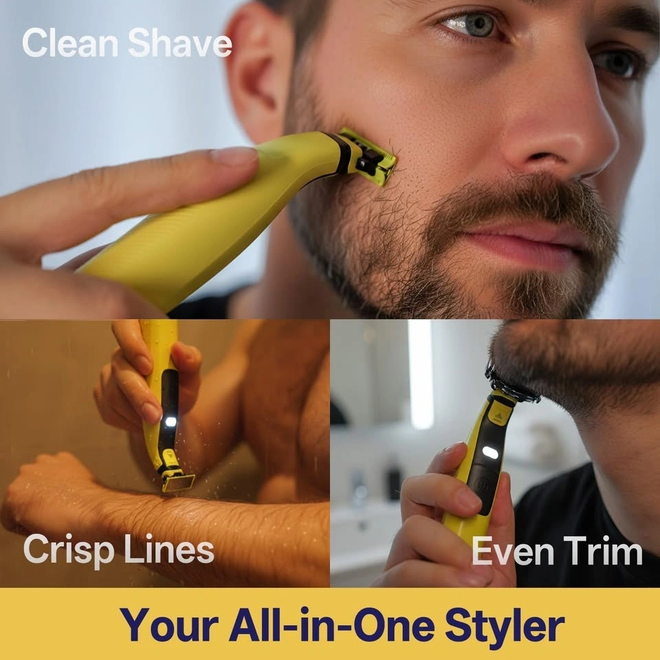 Complete OneBlade 360 kit. Includes two handles (one for face/body, one for nose/ear) and multiple comb attachments for custom lengths. Features USB-C charging, a 90-minute battery life (1-hour charge), and a built-in LED light for precise trimming. An all-in-one styler for shaves, lines, and trims.