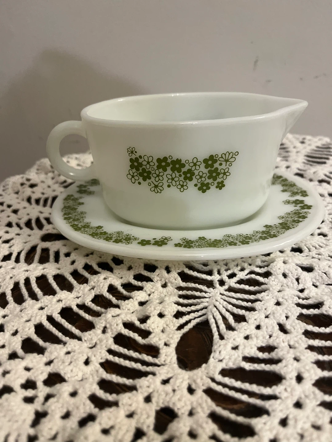 White Pyrex gravy boat and saucer set. Features a green floral pattern. This set is perfect for serving sauces and gravies at your next dinner party!