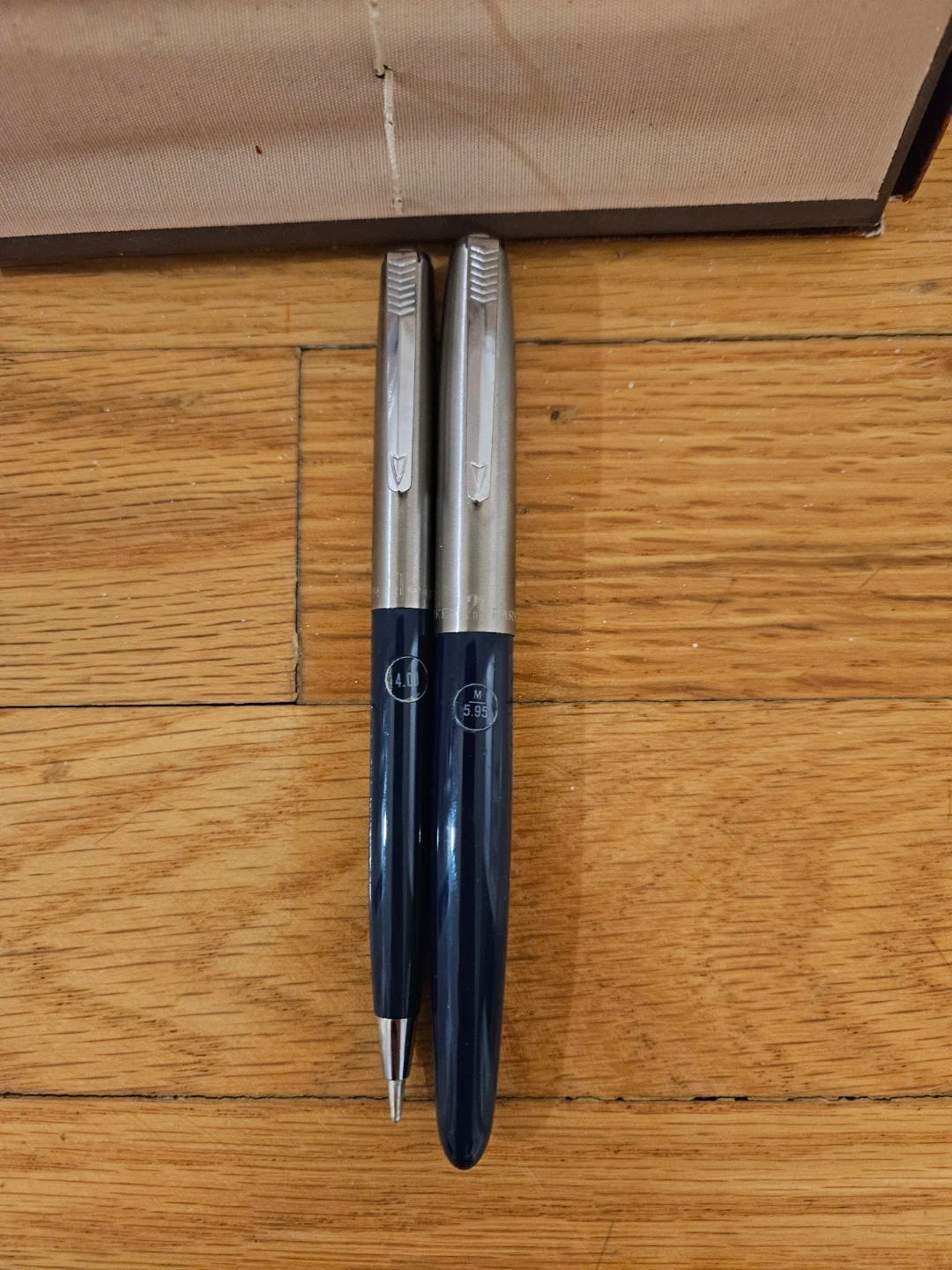 A classic Parker pen and fountain pen set in a deep navy blue and silver. This set includes a ballpoint pen and fountain pen in original box. It's a great set for anyone who appreciates fine writing instruments.