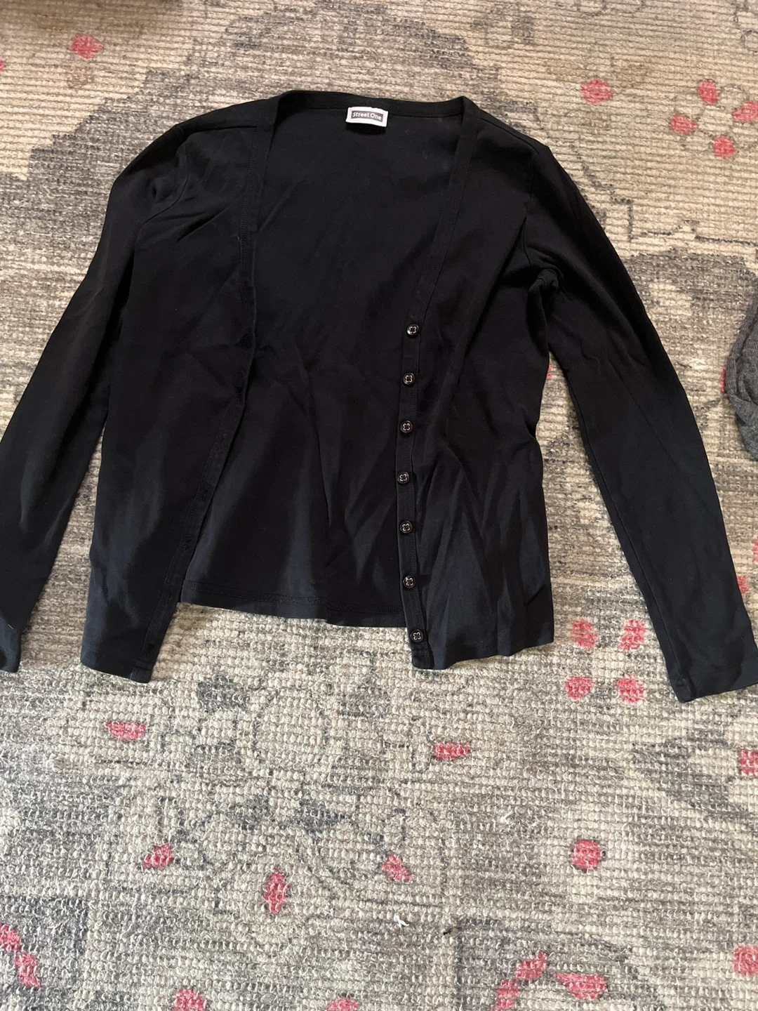 This is a black cardigan from Street One. It has long sleeves and button closures down the front. The material is soft and comfortable.