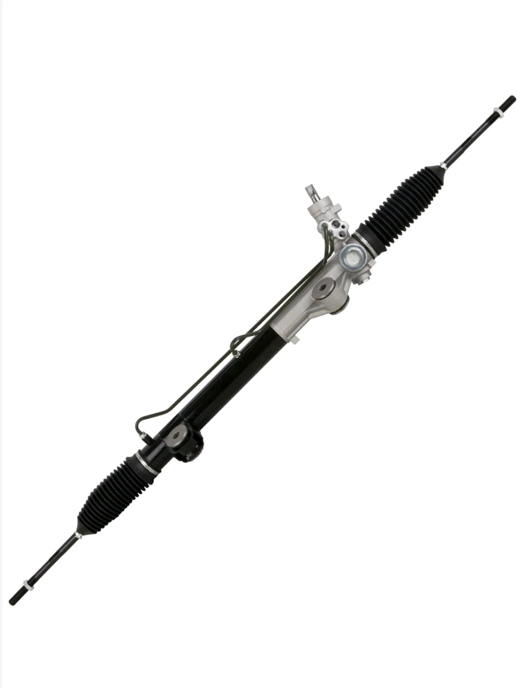 This is a power steering rack and pinion assembly designed for 2WD Ford F150 and Lincoln Mark LT vehicles from 2004-2008. It features machine-finished shafts for a tight seal and smooth operation. Hydraulic lines are fully fluid tested at high pressure. It includes premium grade bellow boots and stainless steel clamps.