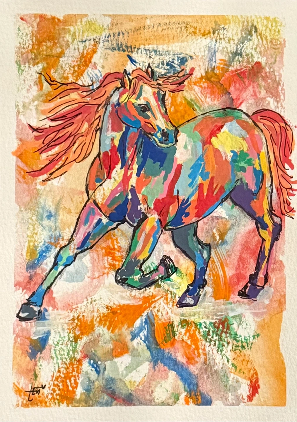 Mixed Media (Gouache, Acrylic & Ink) painting of an abstract horse on 5” X 7” 300gsm watercolour paper.