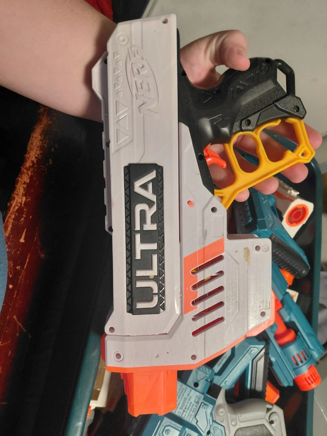 White Nerf Ultra toy blaster with orange and black accents. Features a yellow trigger grip and orange barrel tip. Made of plastic.
