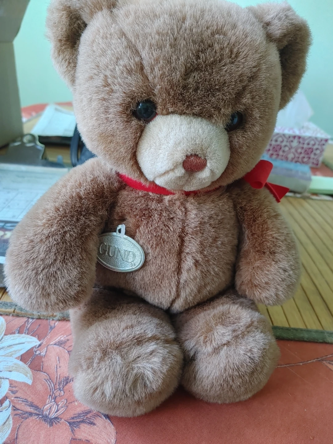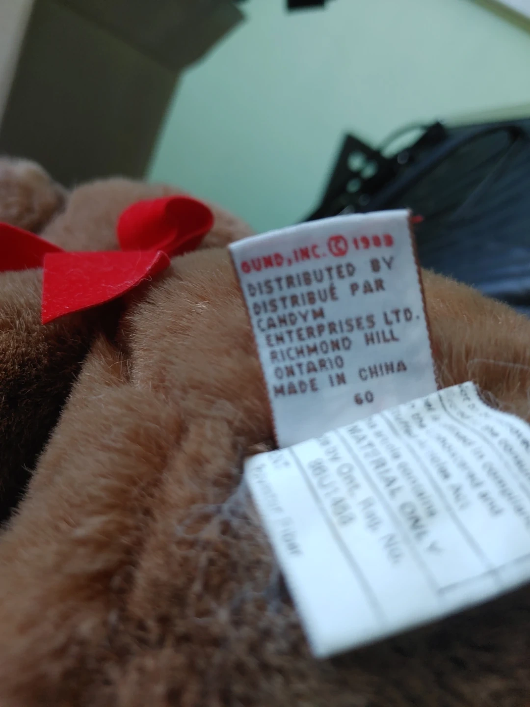 This is a classic brown teddy bear plush toy from GUND 1983 It features a red ribbon around its neck and a GUND tag. The material is soft polyester fiber, and it's machine washable. Surface wash, remove toys before washing. Air dry or low heat.