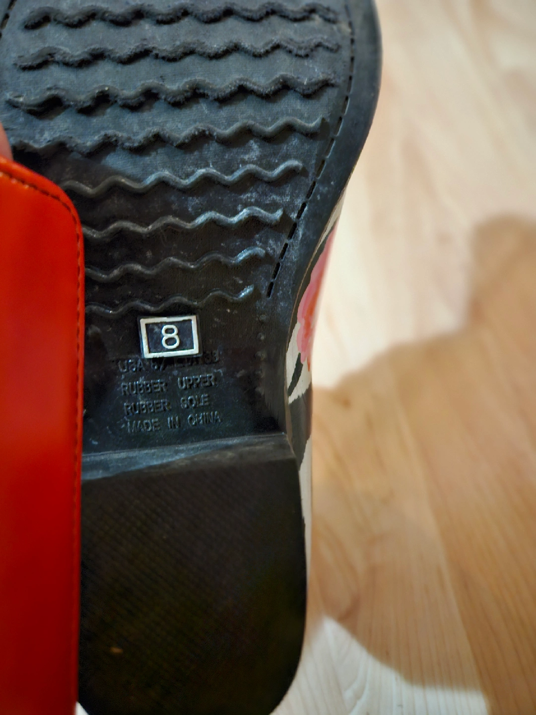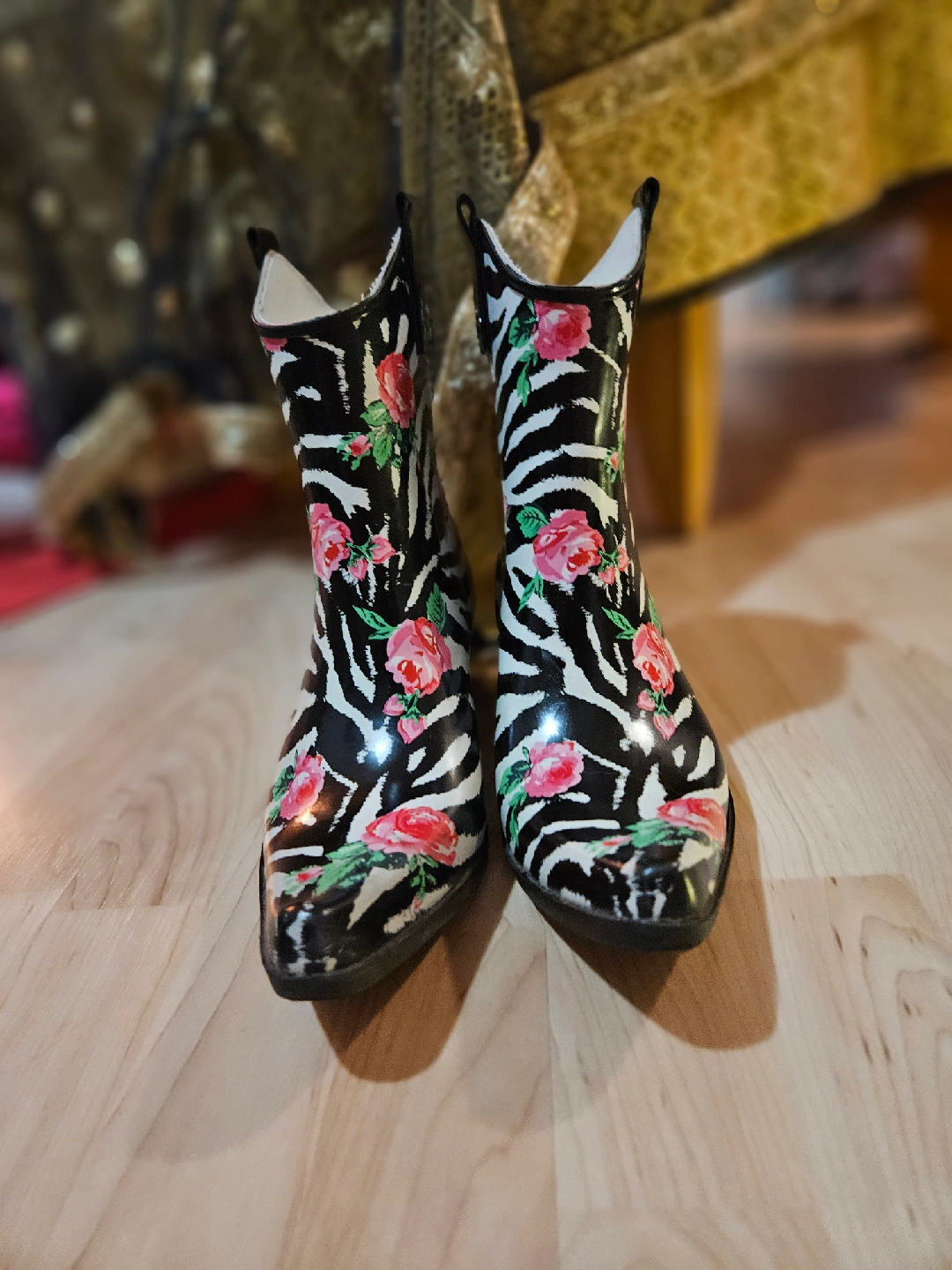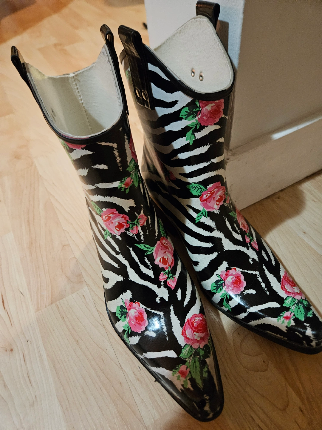 75These rain boots are so fun! They feature a zebra print with a floral design, perfect for adding a pop of style to rainy days. They are a women's size 8