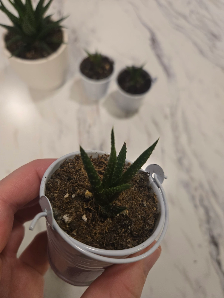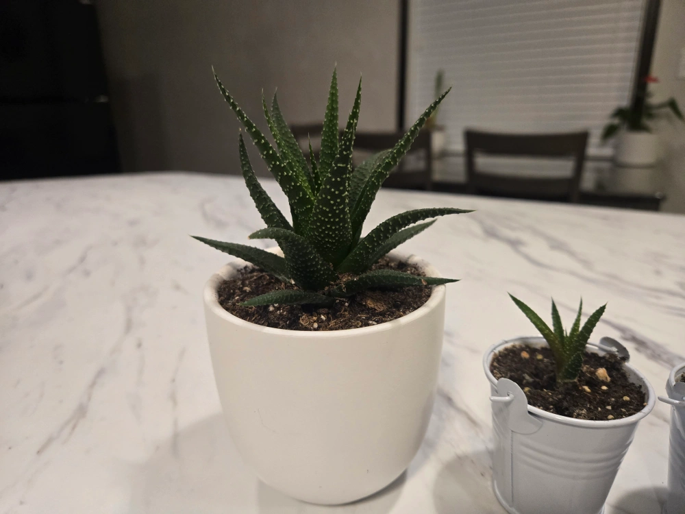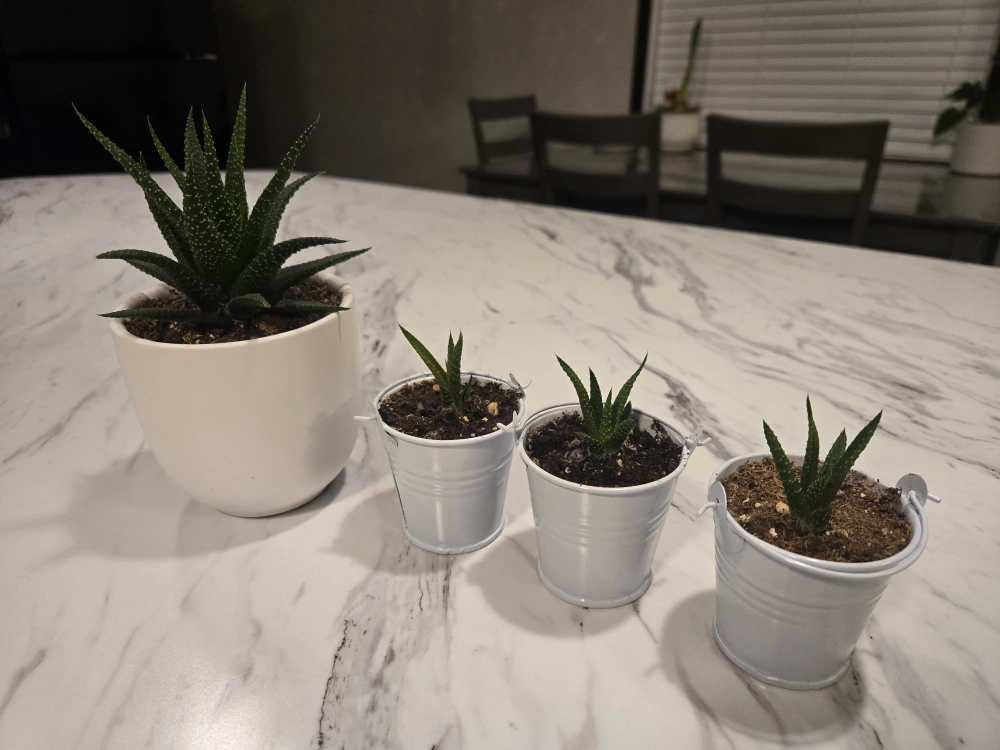 I'm selling these cute Haworthia succulents! They come in their own little white pots, ready to brighten up any space. Perfect for adding a touch of green to your home or office only selling the baby plants, the first one on the pic is the mom plant, she is not for sale $5 each with pot