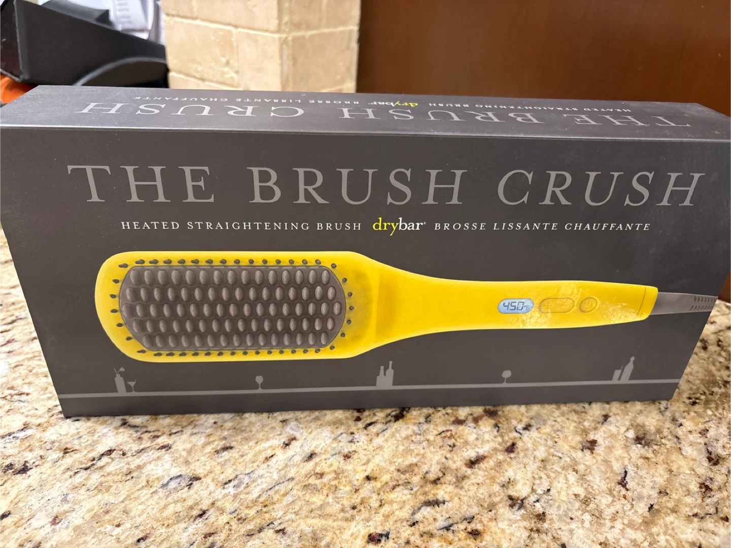 The Drybar The Brush Crush heated straightening brush. It's yellow and features a digital display showing 450°F. Includes original packaging. Retails for $181