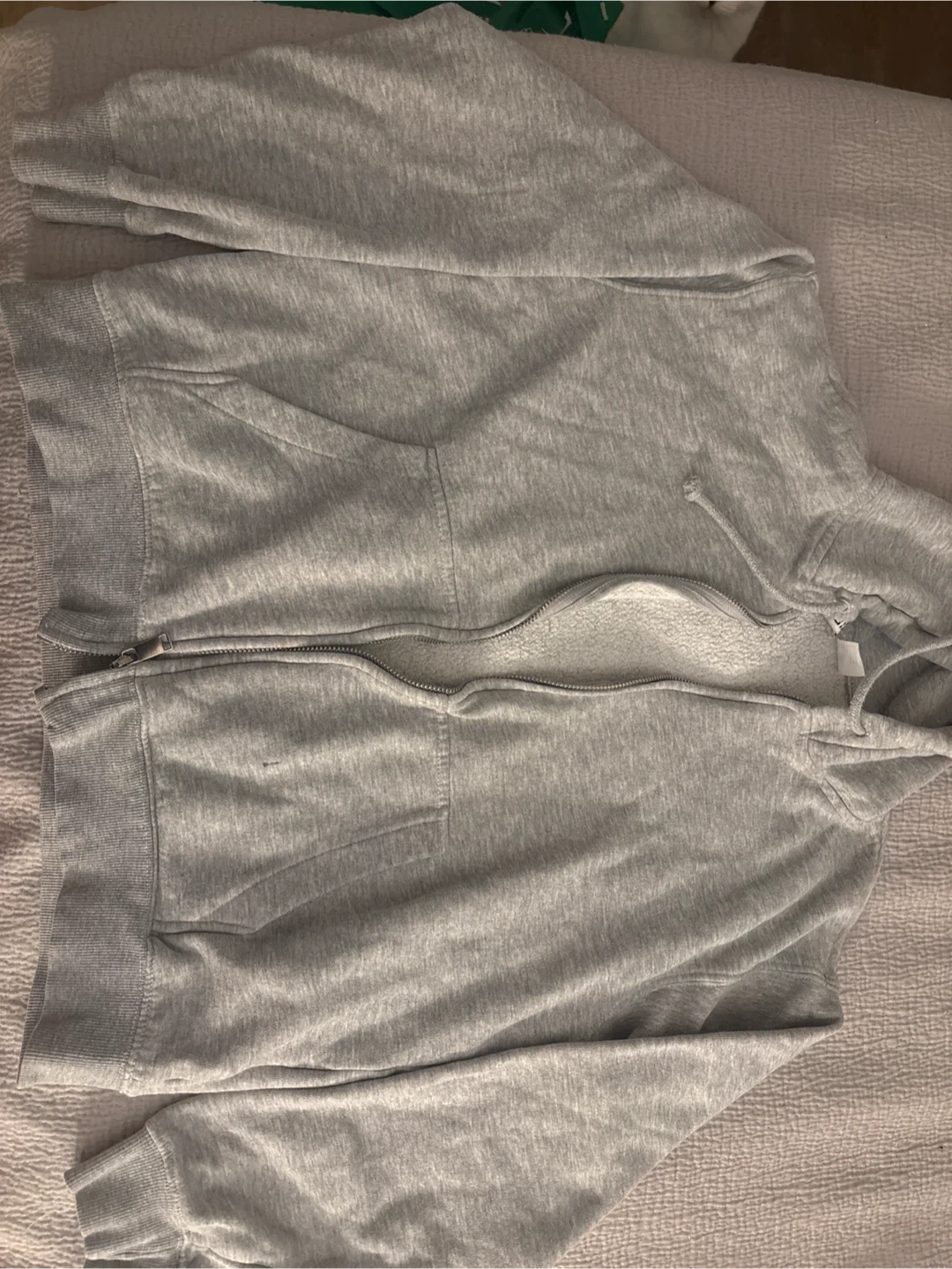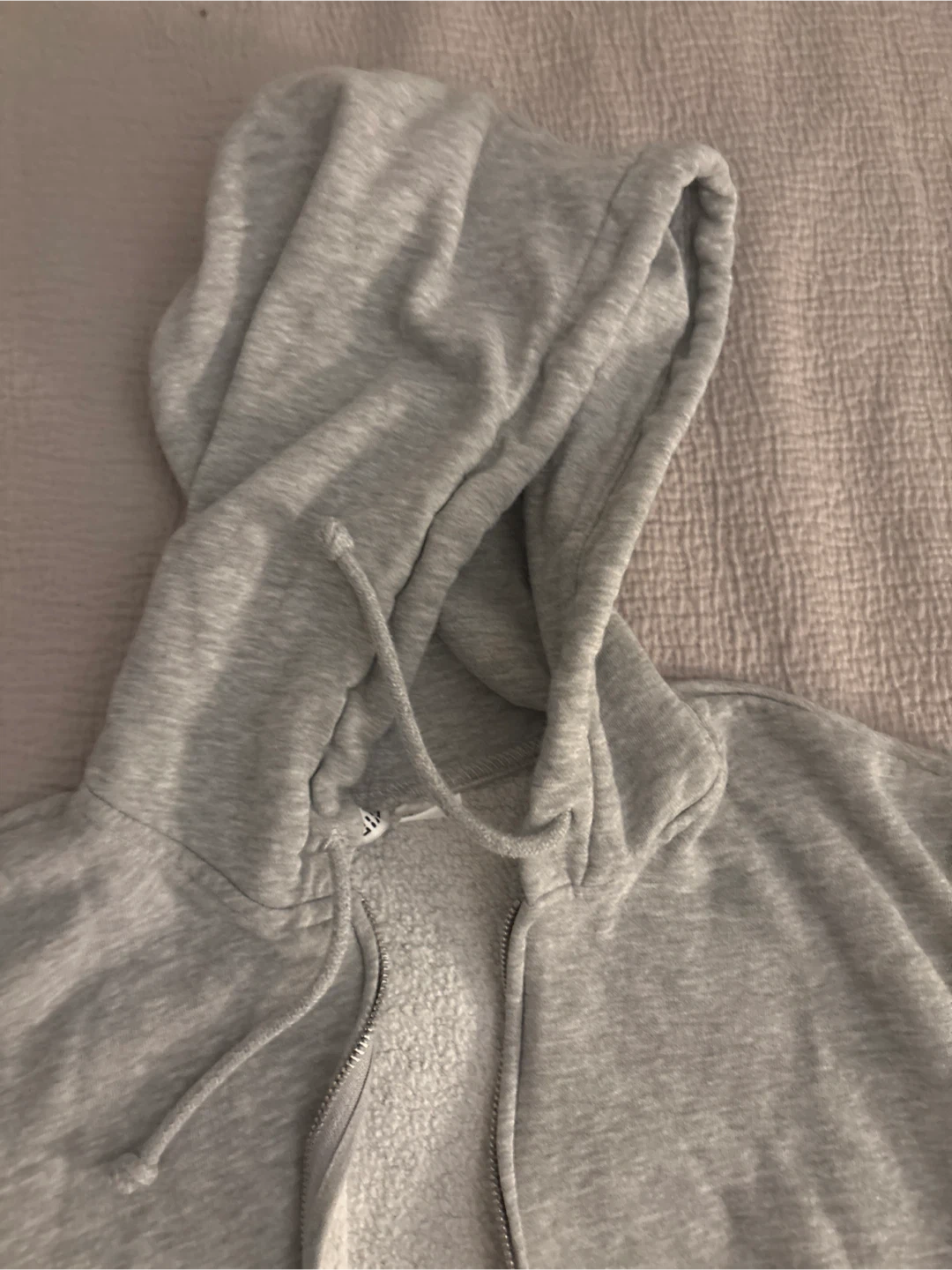 This grey zip-up hoodie is from H&M Divided. It's made of a soft cotton blend with a fleece lining. Features a full zipper, two front pockets, and a drawstring hood. Size XXS.
