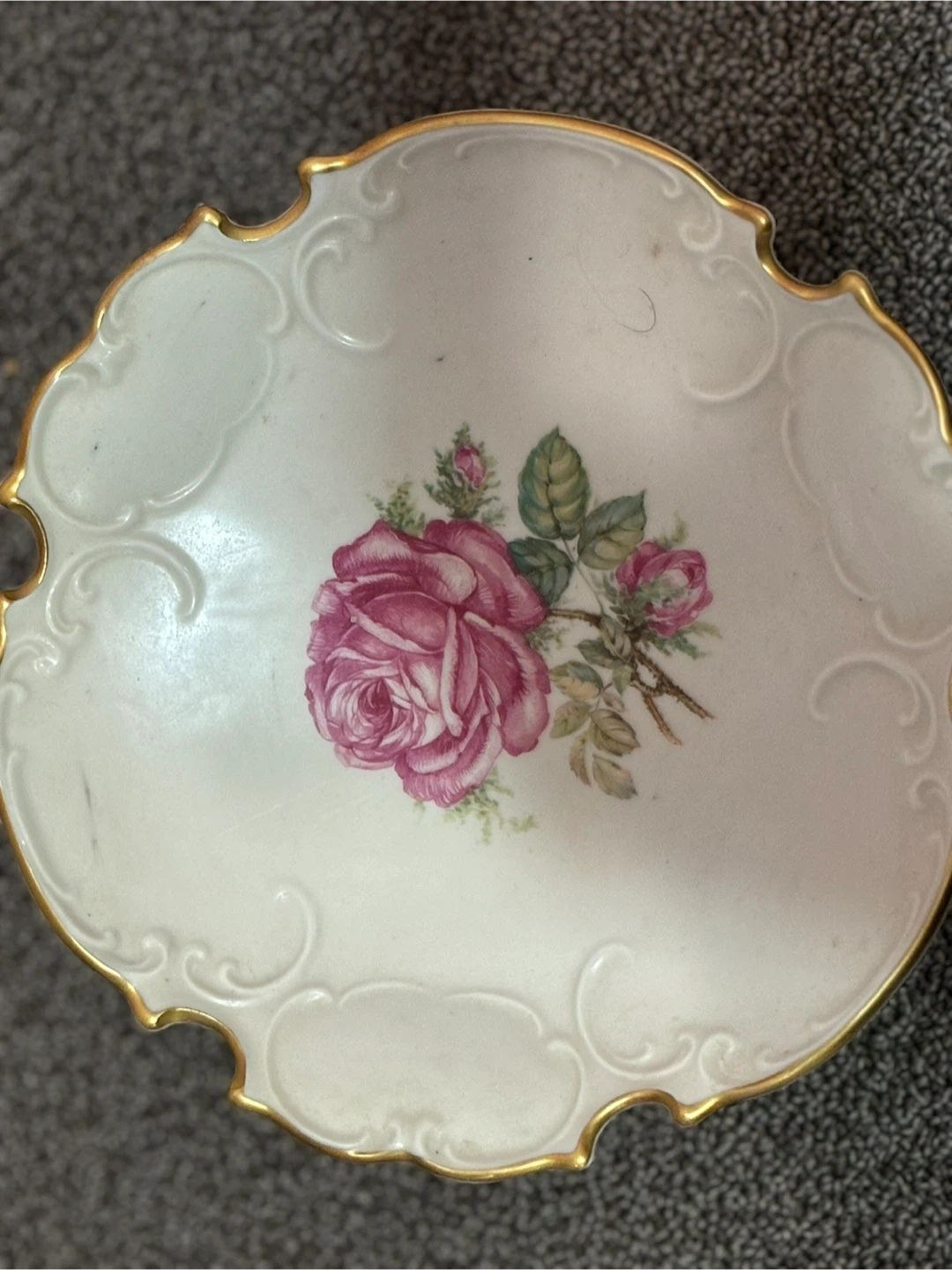 Selling a lovely Zechmanner Celta trinket dish! It features a beautiful rose design and gold trim. Perfect for holding small items or as a decorative piece for your home