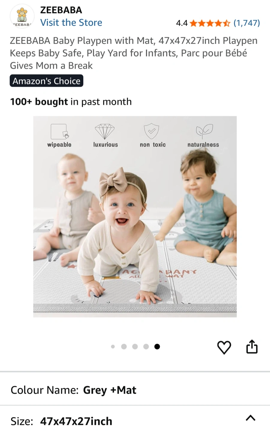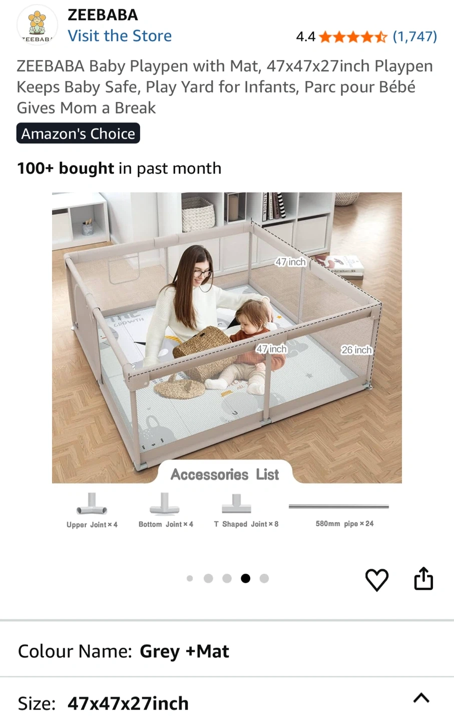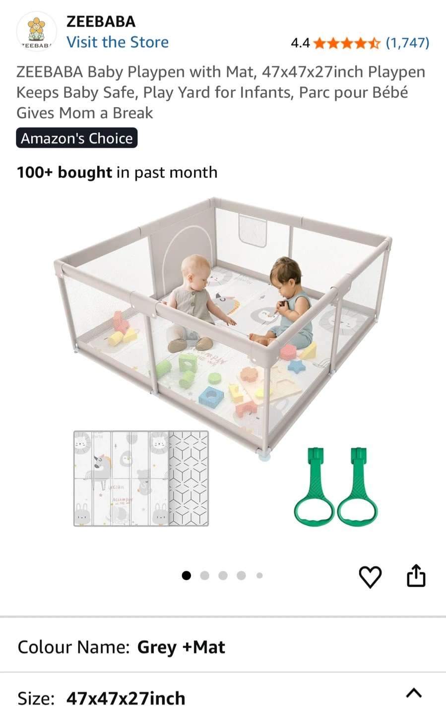 145Brand ZEEBABA Colour Grey +Mat Material Polyethylene Item weight 3.72 kg Item dimensions L x W x H 119.4 x 119.4 x 68.6 Centimetres Floor area 2209 Square Inches Spacious Baby Playpen for Small Areas:This 47*47*27inch baby playpen is great for small spaces, 3-4 babies or 2 adults can be in baby playpen. it's a baby playpen with mat that will keeps your baby safe while you cook, wash, conversate on the phone, and more. You don't have to worry about your kid getting wounded while you do your chores. You don't have to keep an eye on them at all times. They can't get out of there without your help because they're enclosed in baby playpen Set Up a Pet-proof area for children: Even if your pet is lovable, animals are still unpredictable. As babies get older and learn to grasp and pull, they’re not always gentle. baby playpen keep babies safe without a pet, babies can safely do tummy time without pet licking his face or pawing at him. or grabbing his toys and then having to chase her down and wash the toy afterward. Plus you can keep all the toys in the baby playpen to avoid the pet Pet's slobber and fur Enhances the value of time spent playing alone: This baby playpen is the most excellent place to leave your baby alone and allow them to engage in independent play. Put them in a baby playpen with their favorite toys so your baby can have fun while hopping around in a big play yard. Good for Travel and Live: The baby playpen provide shelter to your little ones during outdoor activities and gatherings. For example, if you are going for a picnic, a baby playpen will act as a shelter for your baby where he can play, nap, and change his diapers without any problem and discomfort. Stabilized Baby Play Mat: Thanks to the XPE, the play mat sticks to the floor perfectly, a baby crawling or learning to walk will not slip, the size is 47*47inch. Soft colour scheme suitable for either gender, this play mat can also put in to the playpen