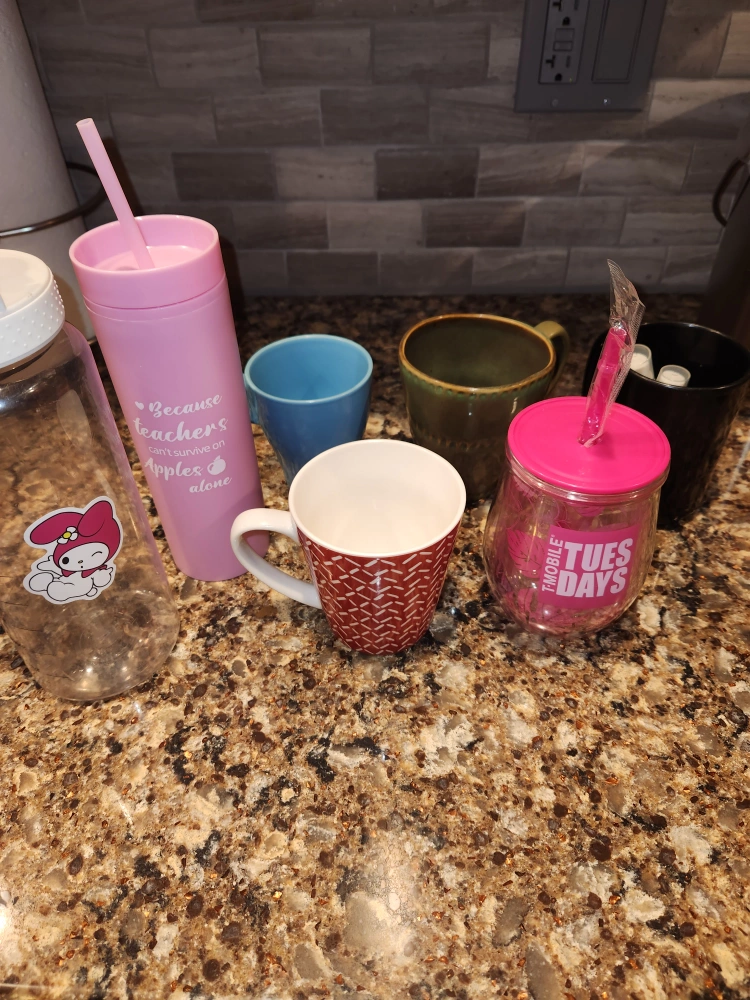 A small collection of mugs and tumblers! There's a variety of colors and styles to choose from. Perfect for adding a little something to your kitchen or office. Some of them are brand new.