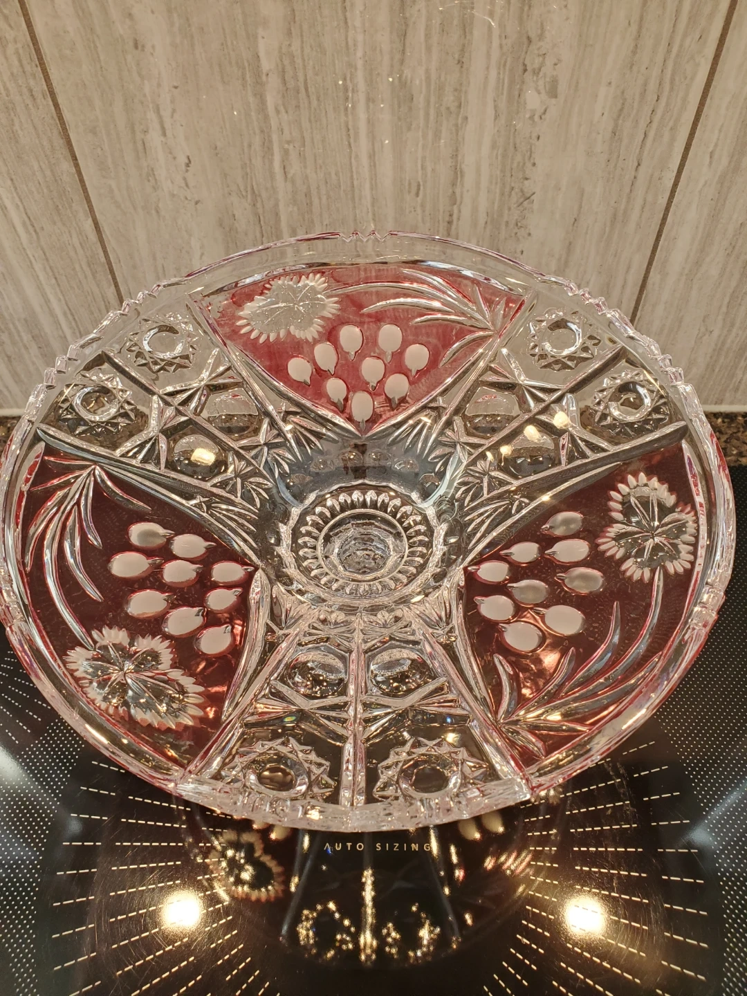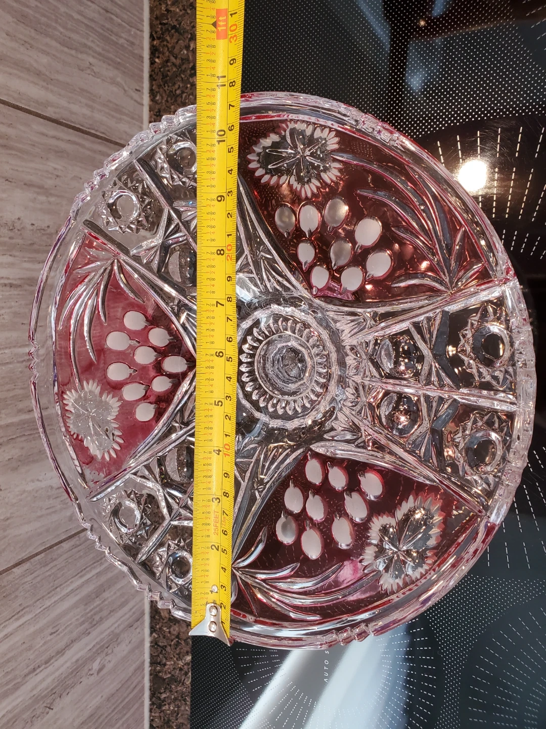 Beautiful cut crystal fruit bowl with a pedestal stand. Features intricate floral and grape leaf cut patterns. Diameter is approximately 11 inches, height 6 inches. This elegant dish is perfect for serving desserts or as a decorative centerpiece.