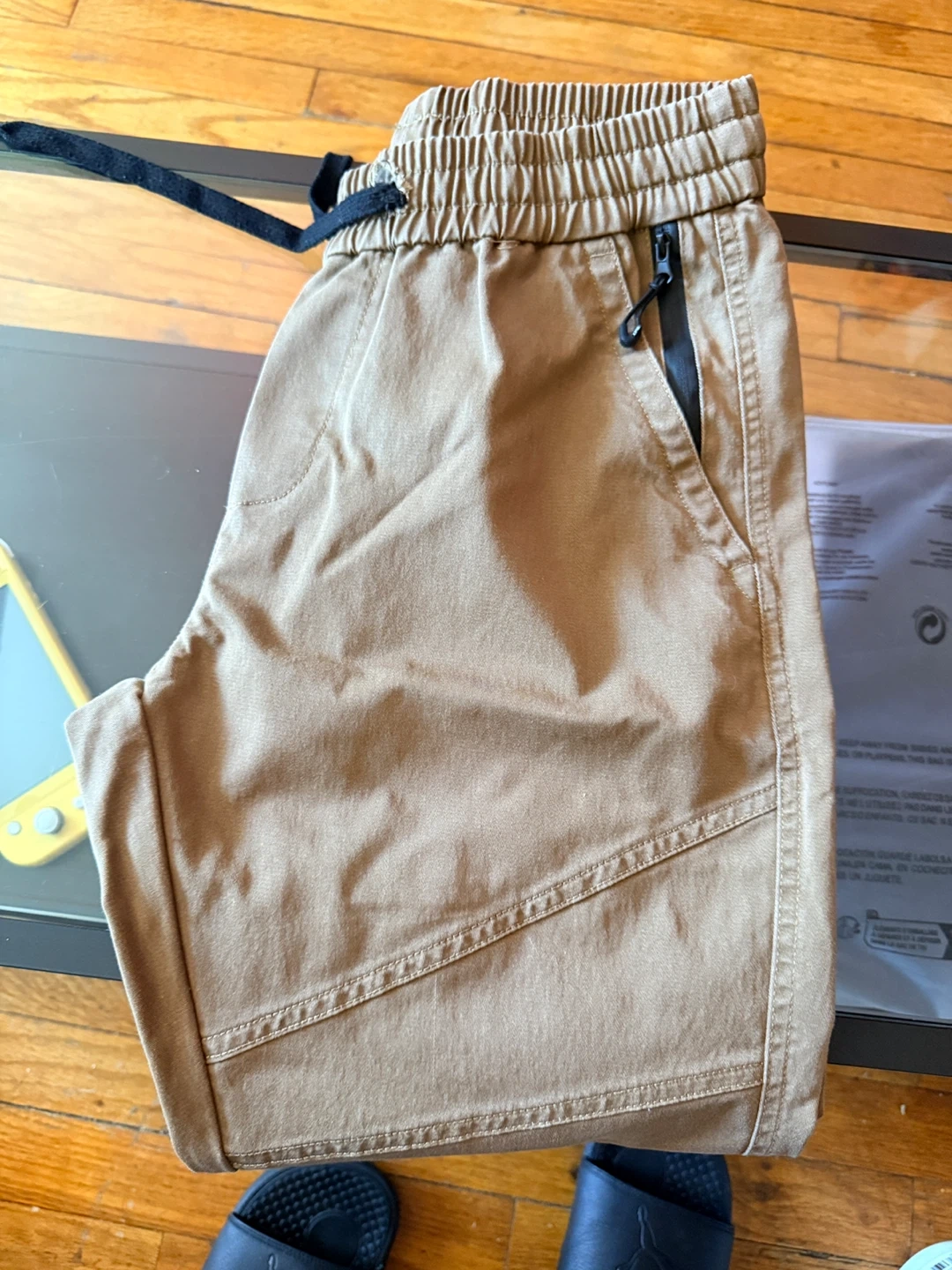 Comfortable men's tan jogger pants. Features a drawstring elastic waistband and zippered pockets. Made with a durable cotton blend fabric.