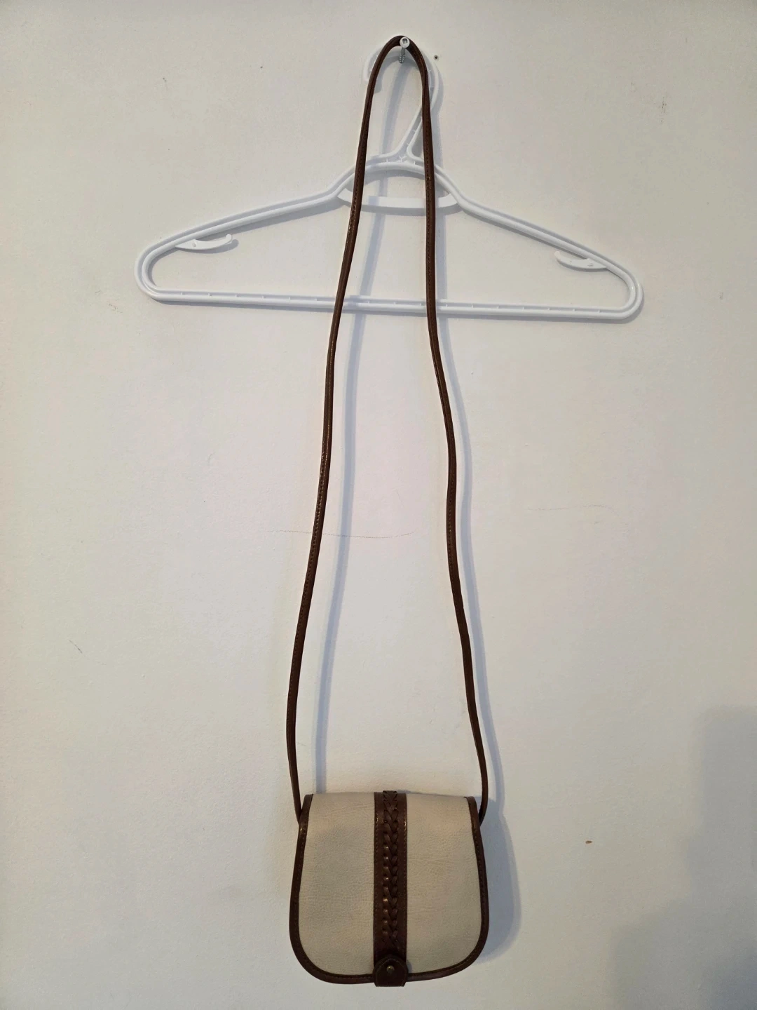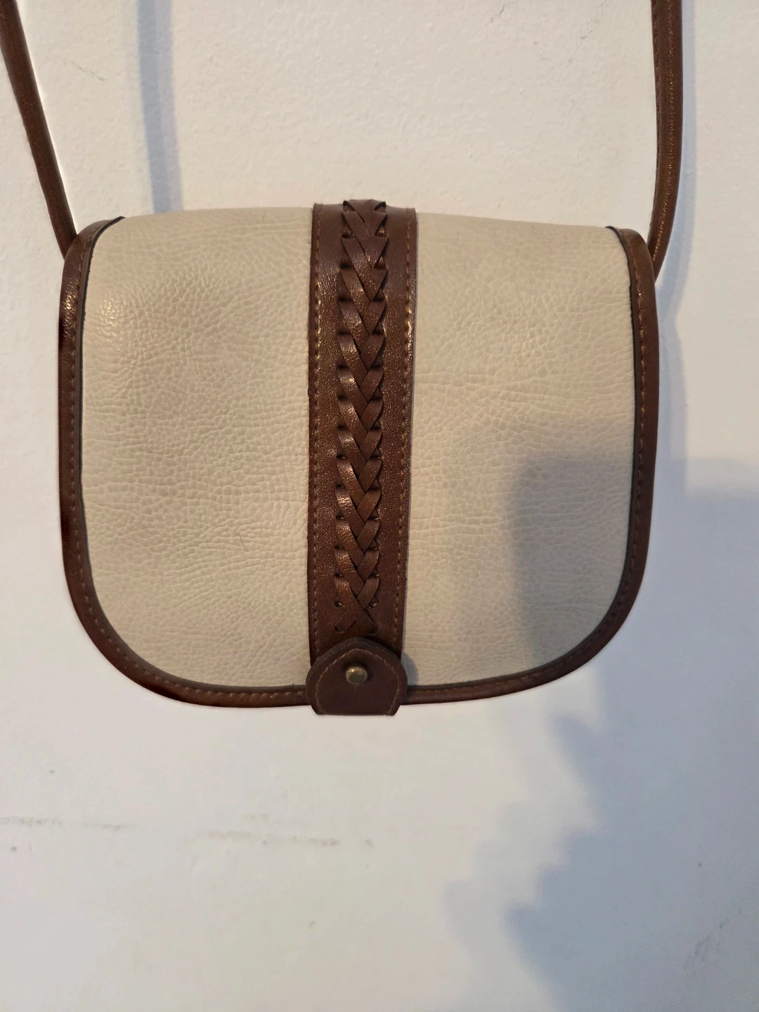 This is a cream and brown Liz Claiborne shoulder bag. It's made of faux leather with a braided accent on the flap. The adjustable strap makes it comfy to wear. $10