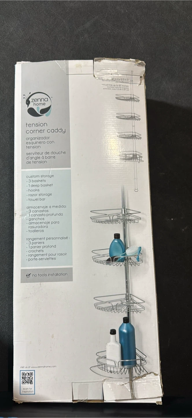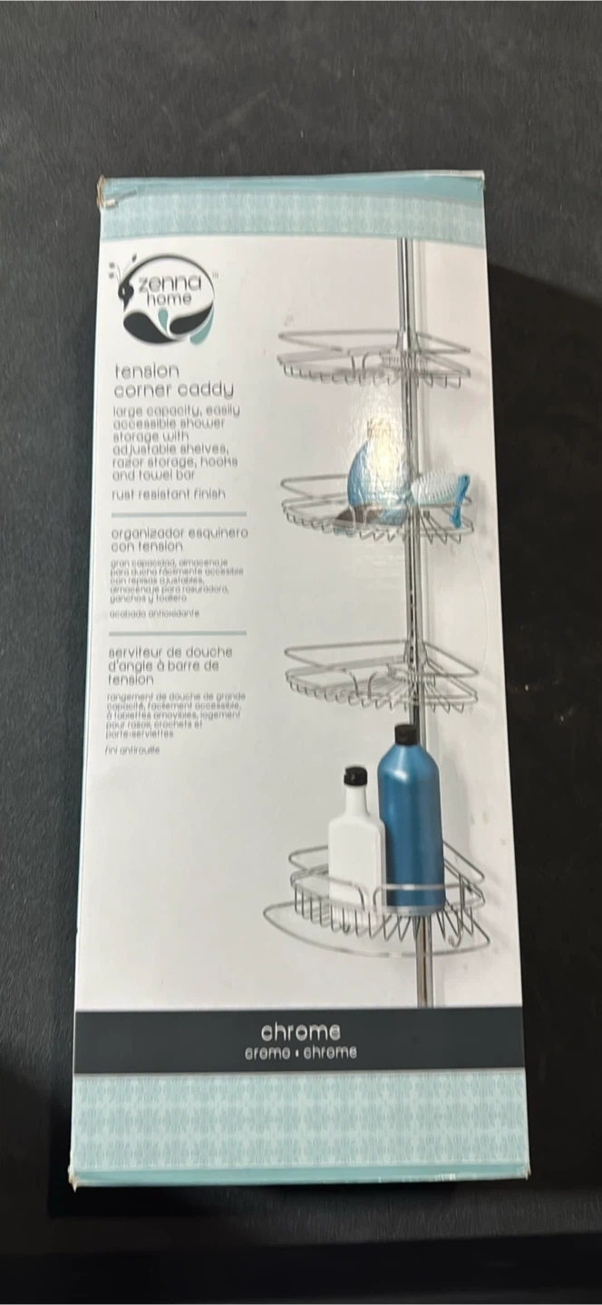 10Selling a Zenna Home tension corner caddy in chrome. It features large capacity, easily adjustable shelves, razor storage, hooks and towel bar. It has a rust-resistant finish and requires no tools for installation. It includes custom storage with 3 baskets and 1 deep basket. (4 total) Still in plastic and unused