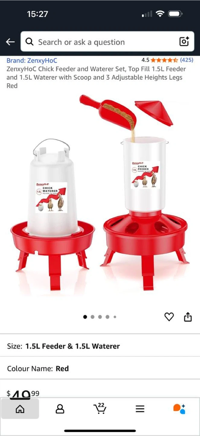๐ฅ ZenxyHoC Chick Feeder & Waterer Set โ 1.5L Feeder + 1.5L Waterer (Red) ๐ฅ Brand new โ Complete set includes: โข 1.5L Chick Feeder โข 1.5L Chick Waterer โข Adjustable height legs (3 levels) โข Scoop included Perfect for chicks, ducklings, and small poultry. Easy to refill and clean. Durable plastic design. ๐ฐ Price: 40 CAD ๐ Pick up in Waterloo