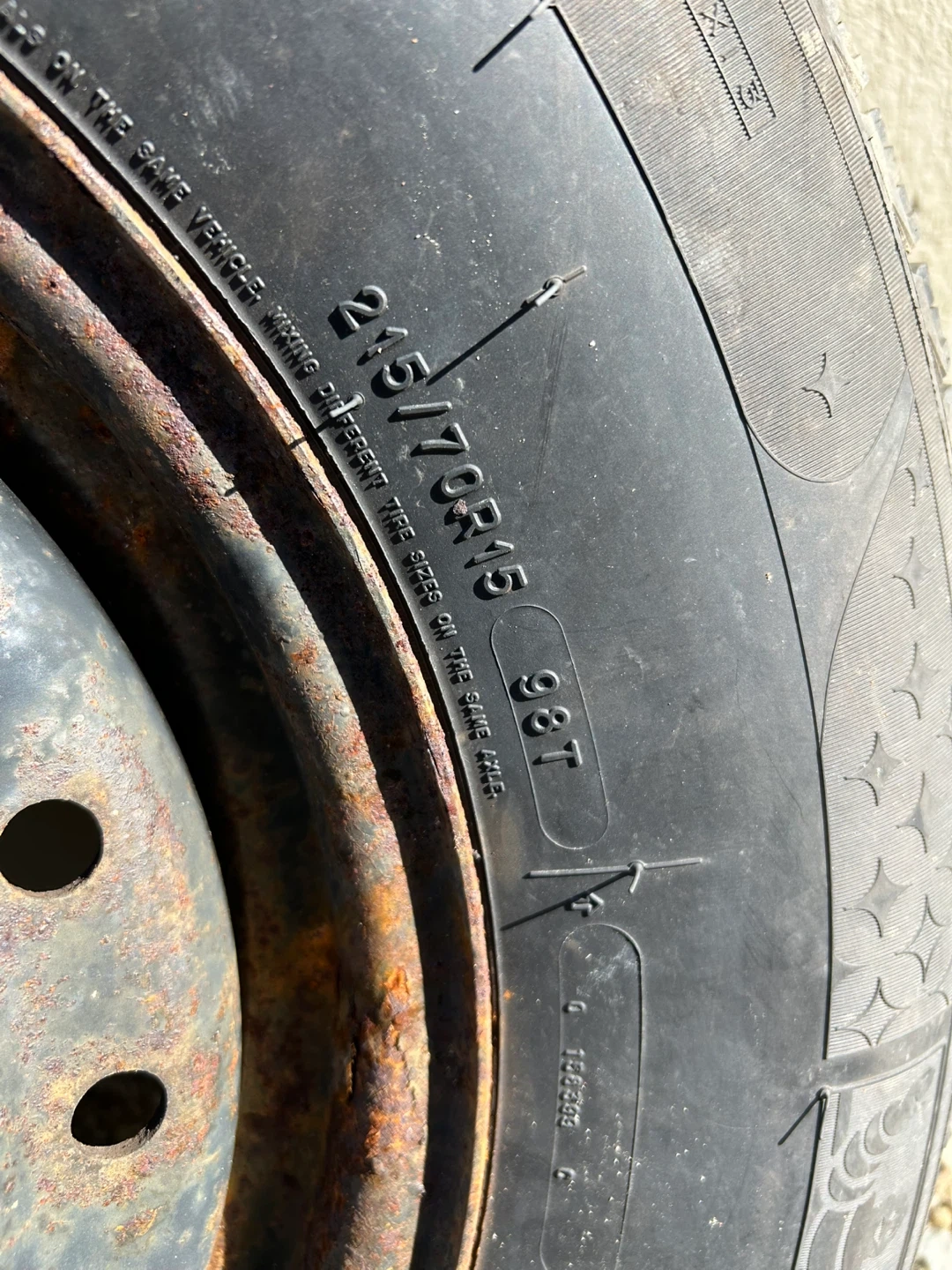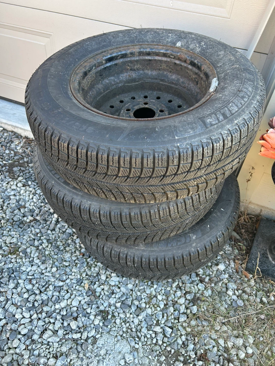 Set of four Michelin 215/70R15 snow tires mounted on steel rims. These tires are good for winter driving conditions. Tires have some rust on the rims, but the tread is still in good shape.