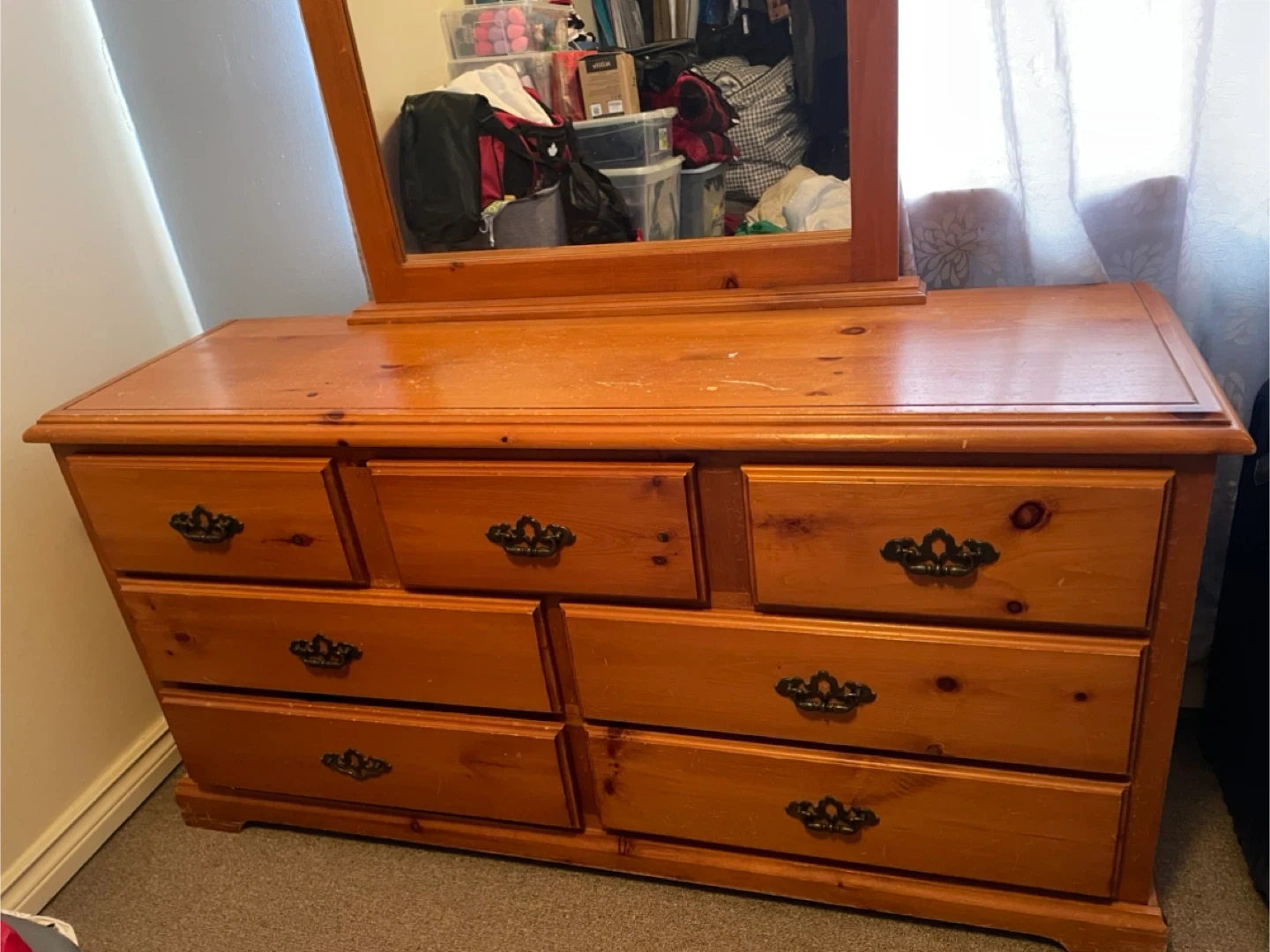A classic wooden dresser with seven drawers and an attached mirror. It's made of solid wood with ornate drawer pulls. Perfect for storing clothes or linens in a bedroom.