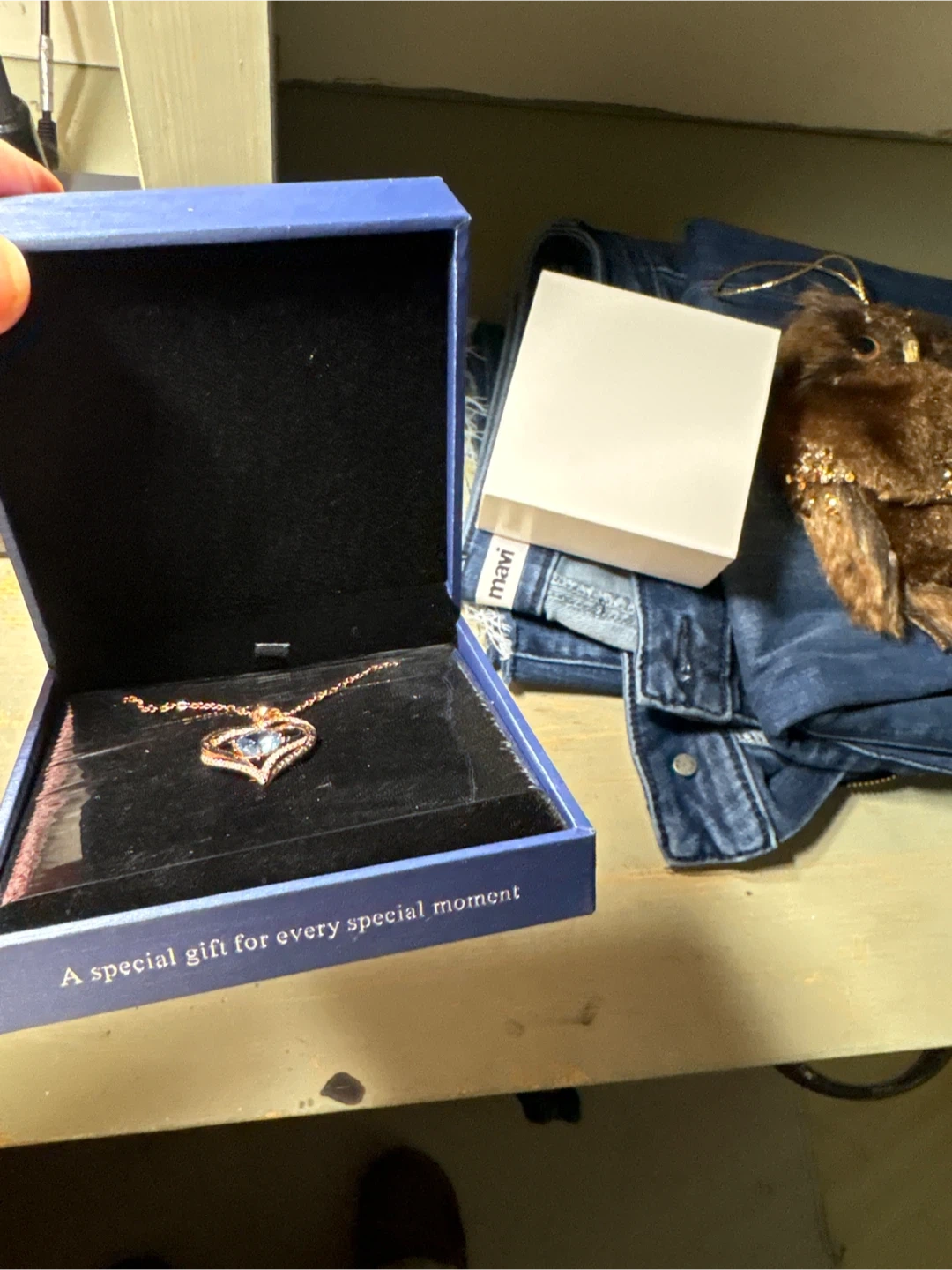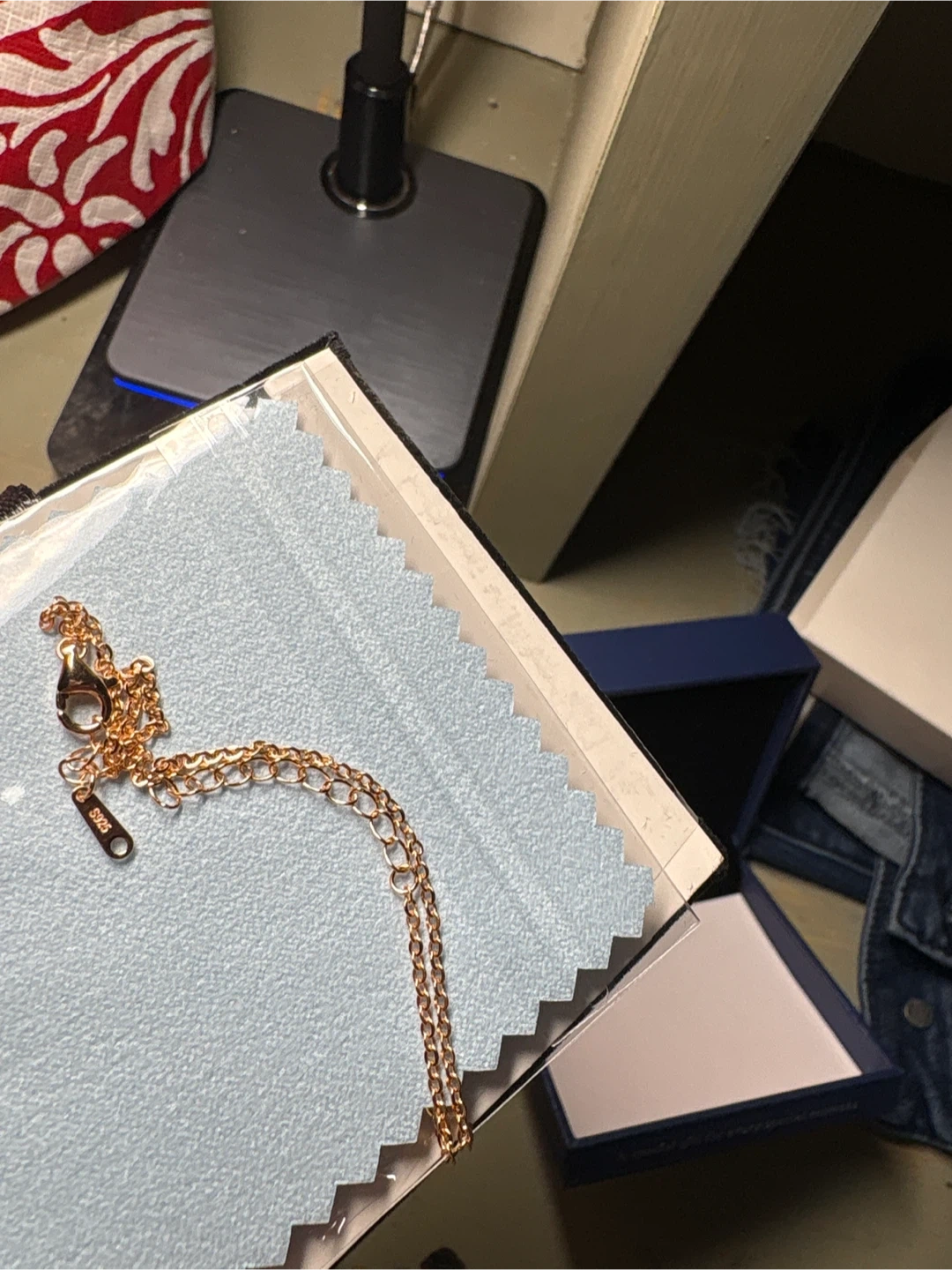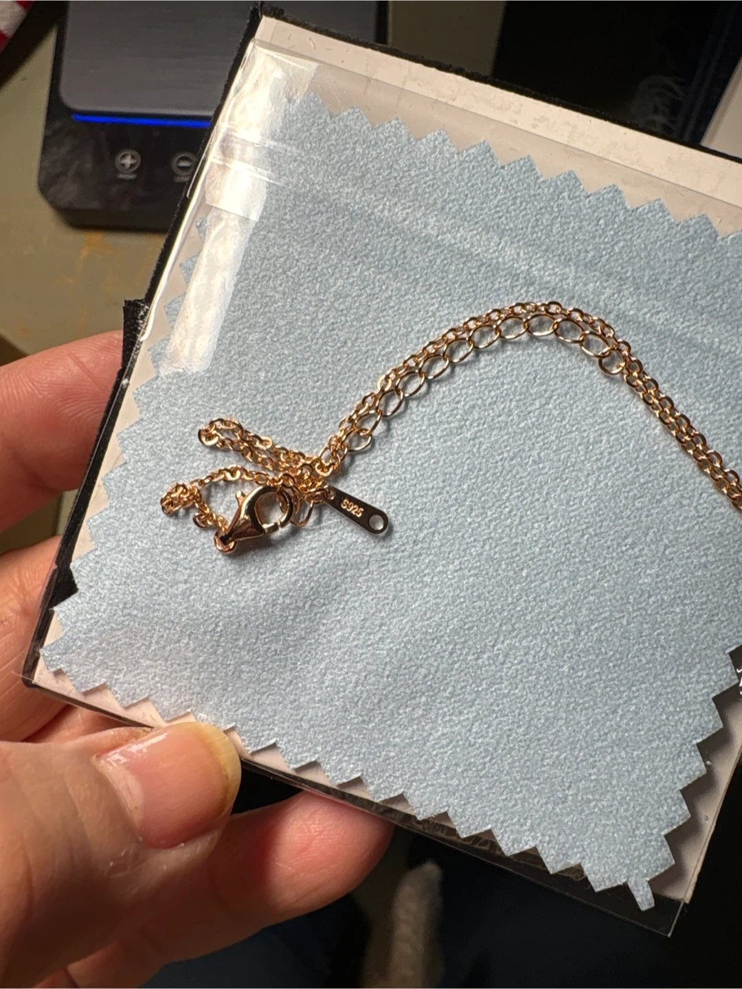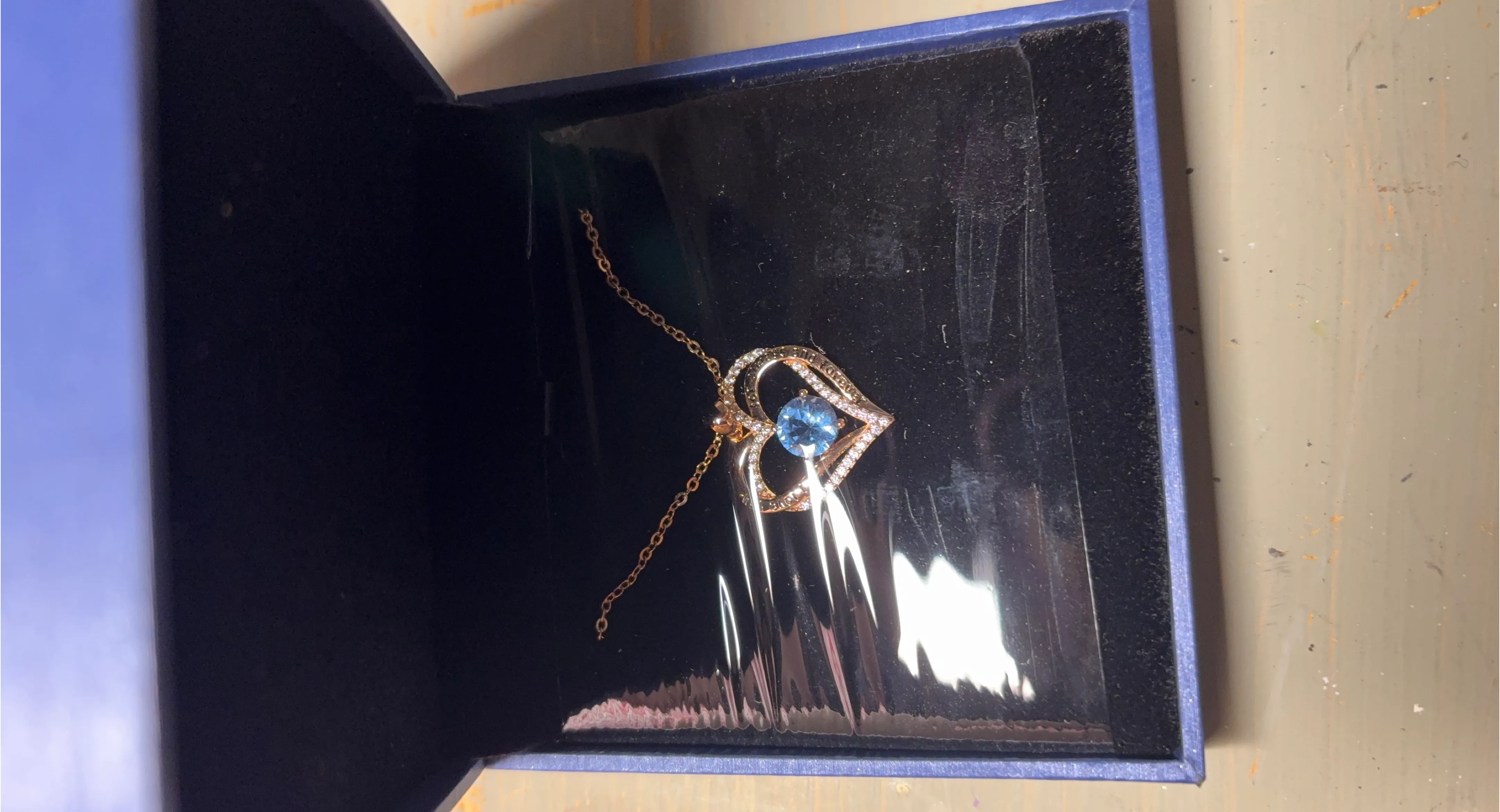 A rose gold chain necklace with a heart-shaped pendant featuring a blue stone. It comes in a blue gift box.