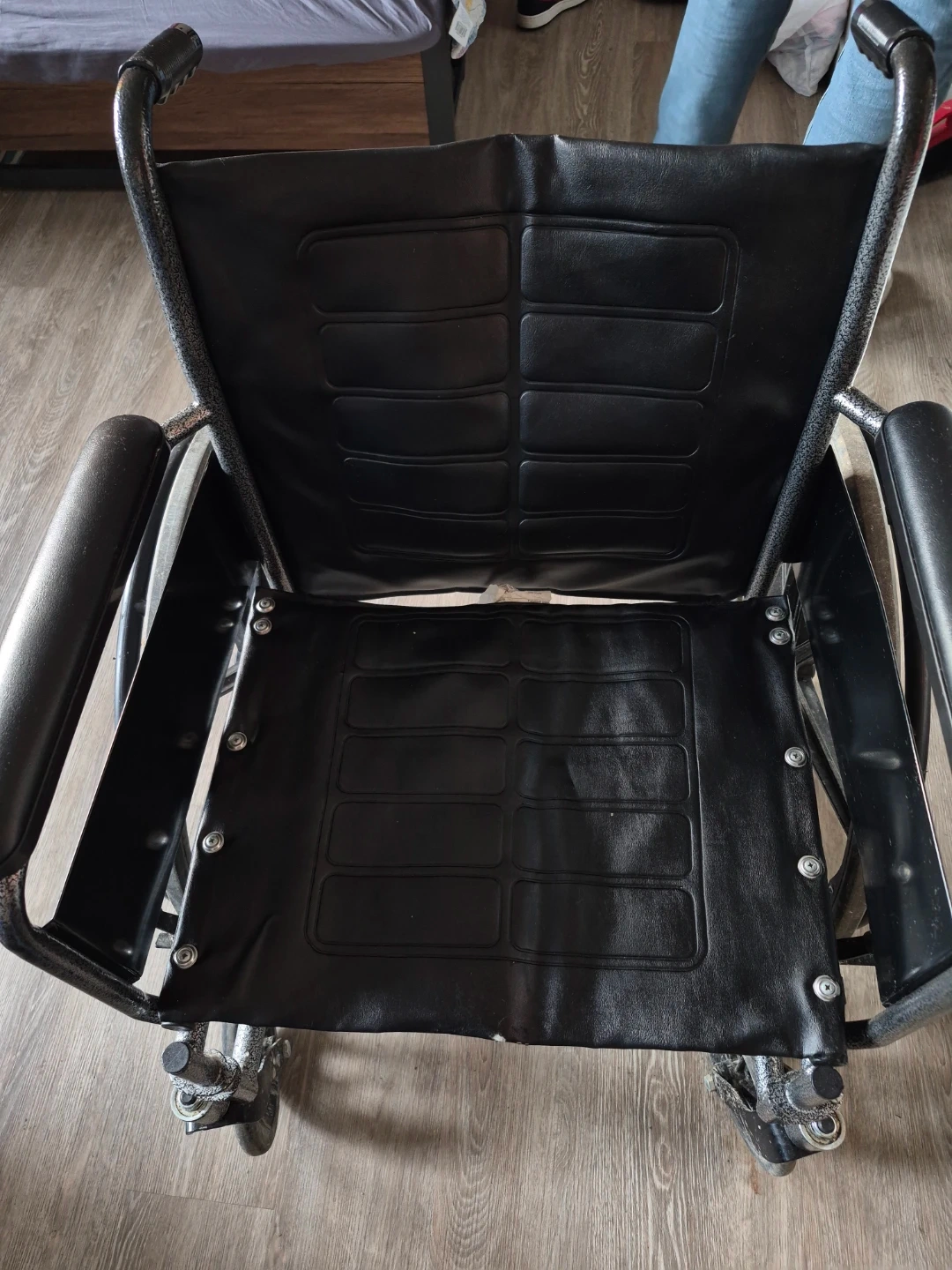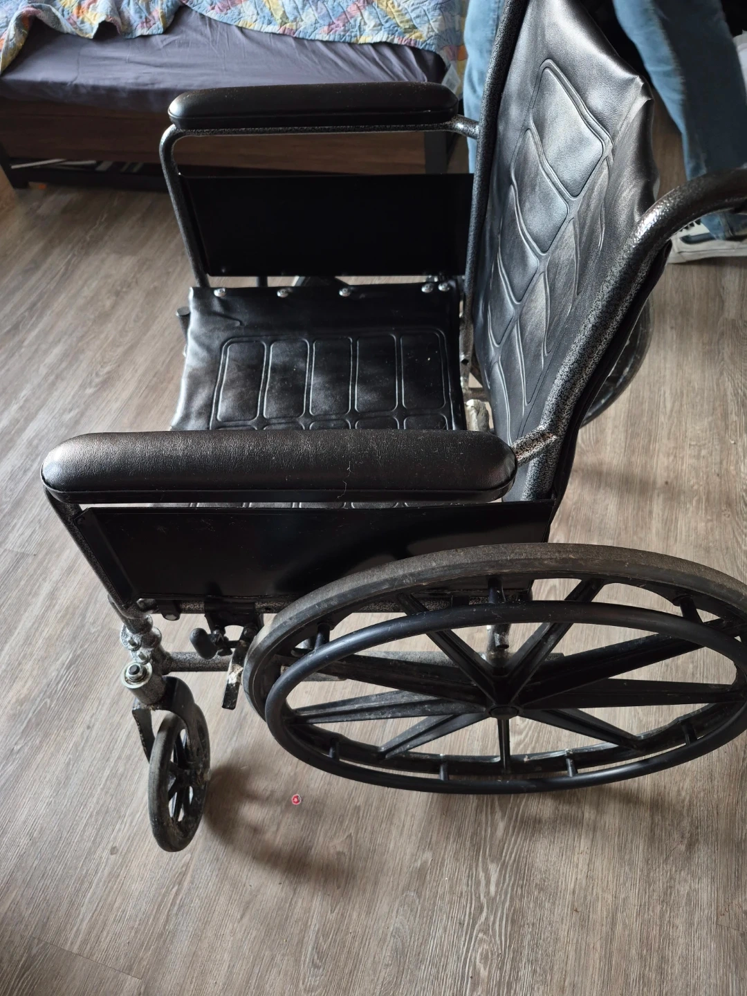 This is a adult black wheelchair. It has padded armrests and a seat with a quilted design. The frame is made of metal and it features large rear wheels with smaller front casters for maneuverability. Suitable for mobility assistance.