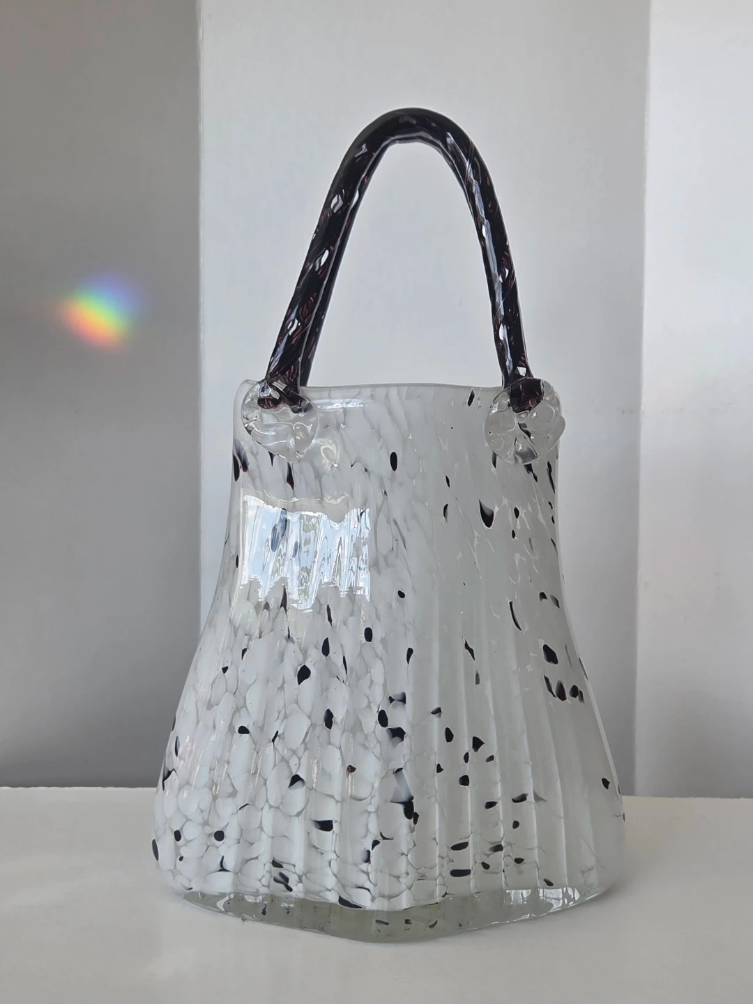 This unique glass vase is designed to resemble a handbag, with a white and black speckled pattern. It features a dark-coloured handle and clear glass accents. Its artistic design makes it a striking decorative piece for any home.