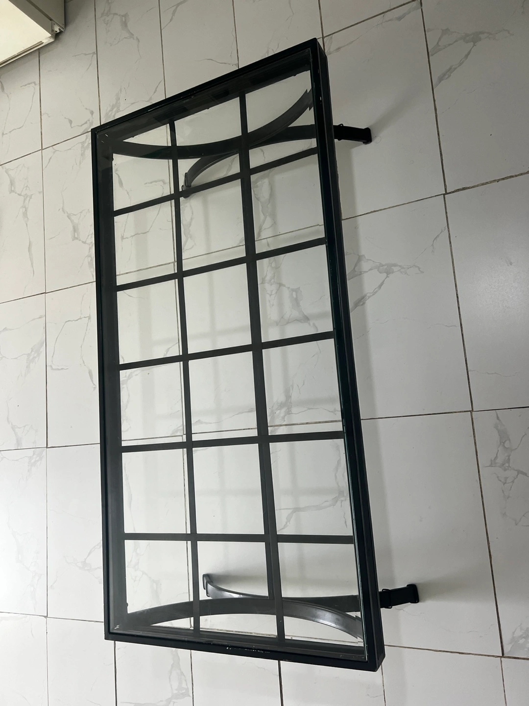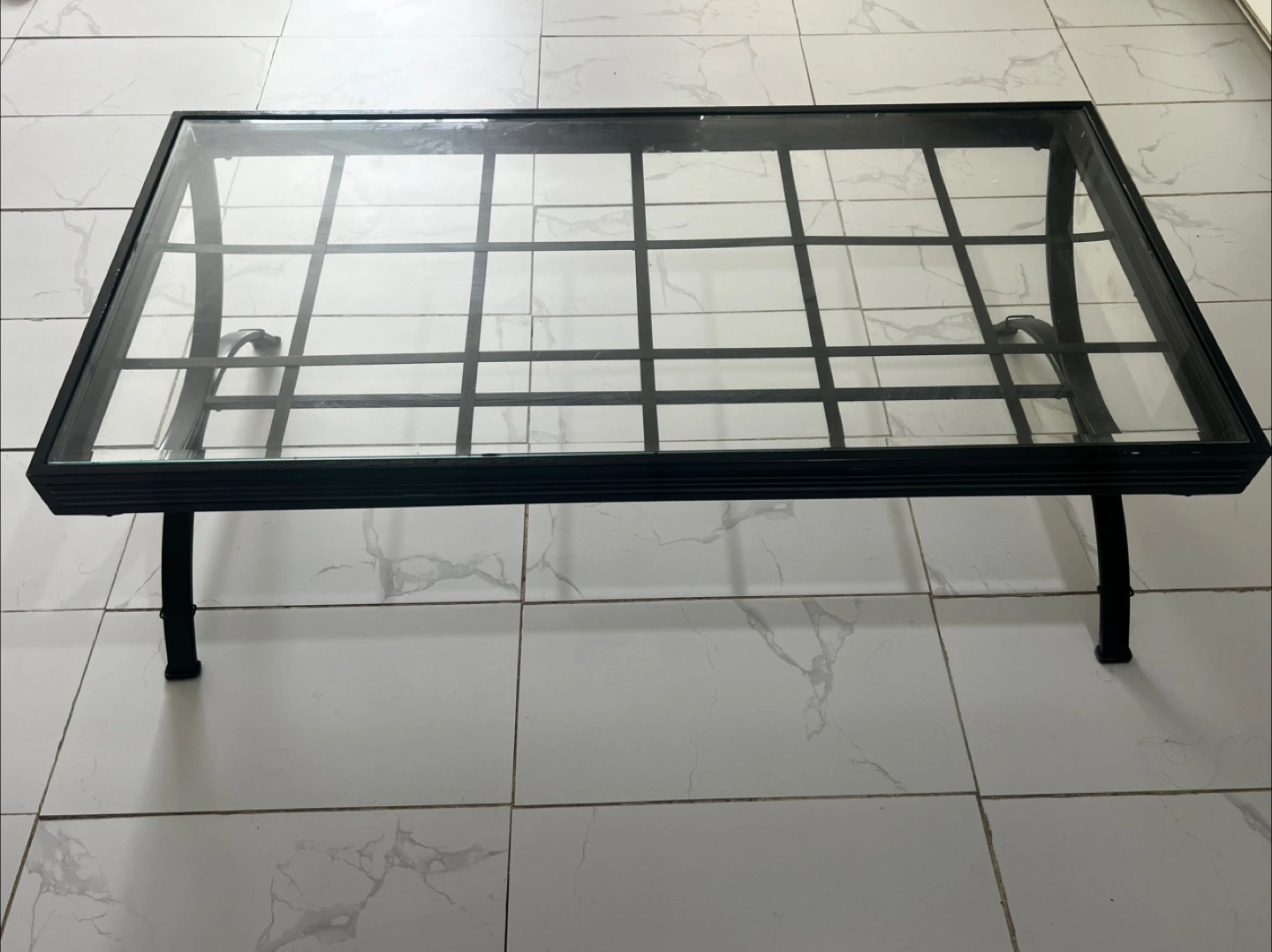 Rectangular coffee table featuring a glass top with a metal frame and legs. The glass has a grid pattern underneath for support. It's a stylish piece for your living room!