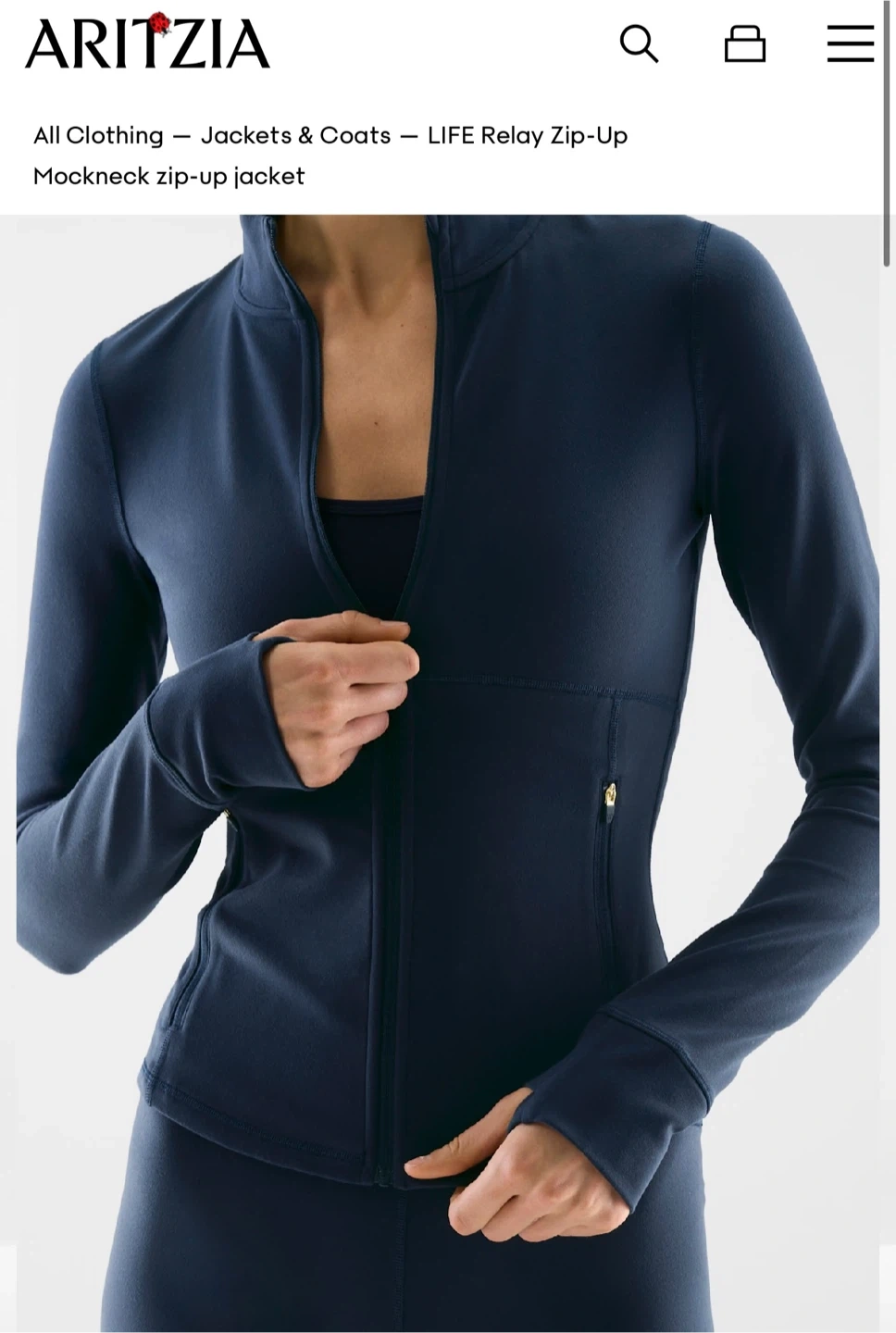 This is an Aritzia LIFE Relay Zip-Up mockneck jacket. It's a navy blue, long-sleeved zip-up jacket with a mockneck. Features include thumbholes and a zippered pocket.