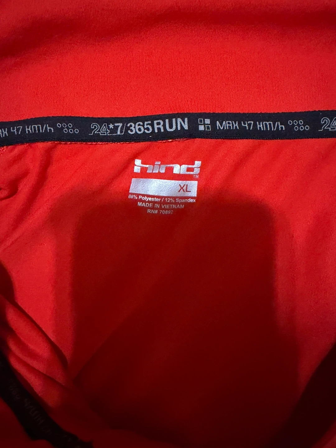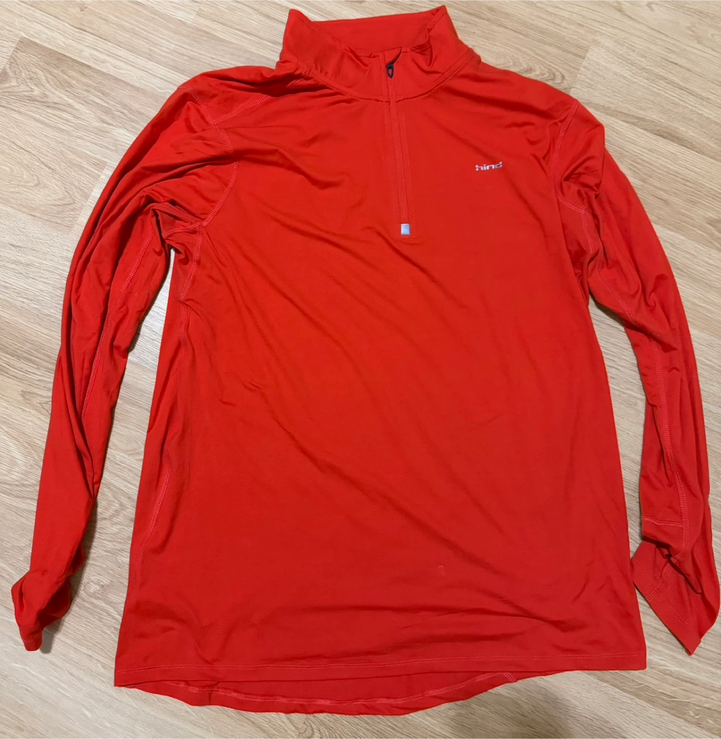This red athletic shirt from Hind features a 1/4 zip neckline and long sleeves. It's made of 88% Polyester and 12% Spandex for a comfortable fit. Size XL.