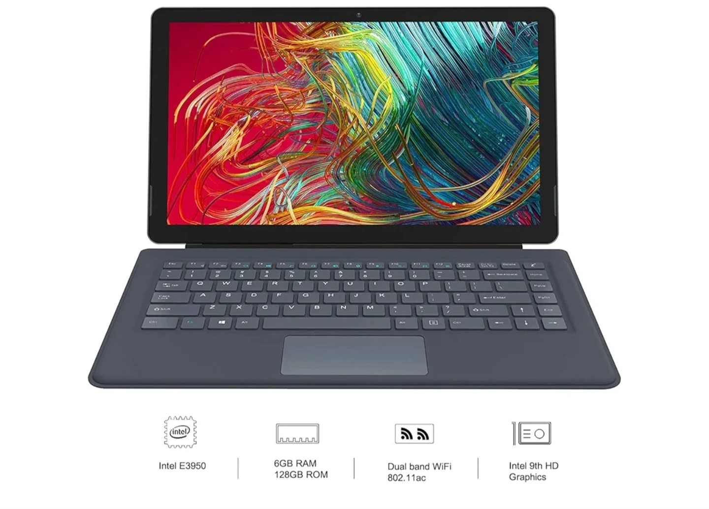 This 2-in-1 device functions as both a laptop and a tablet. It's powered by an Intel E3950 processor and features 6GB of RAM and 128GB of ROM. Connectivity includes dual-band WiFi 802.11ac and Intel 9th HD Graphics. It weighs approximately 2.24 lbs. Charger and stylis not inlcuded