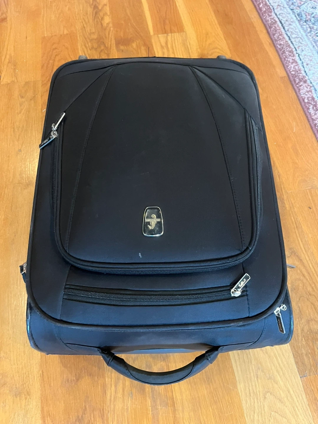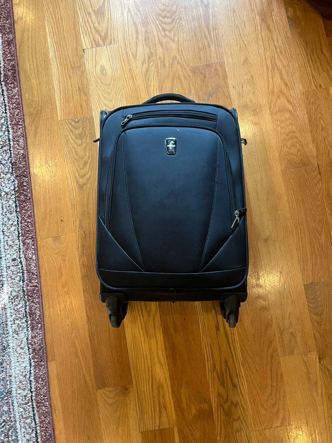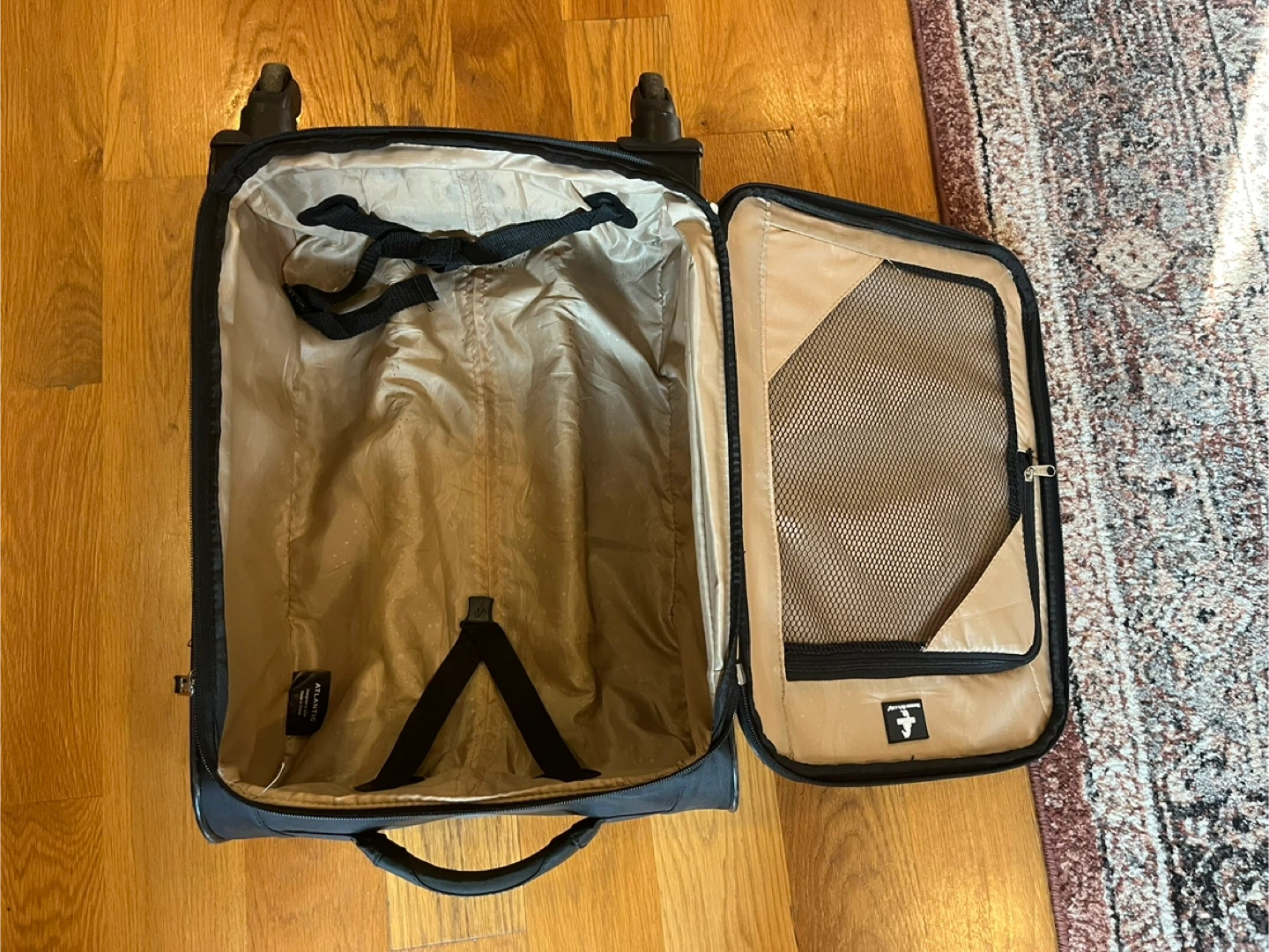 This is a black Atlantic carry-on suitcase with wheels. It features an expandable design and internal compression straps. The interior has a mesh zippered compartment on the lid. It has some wear and tear, but everything functions as intended.