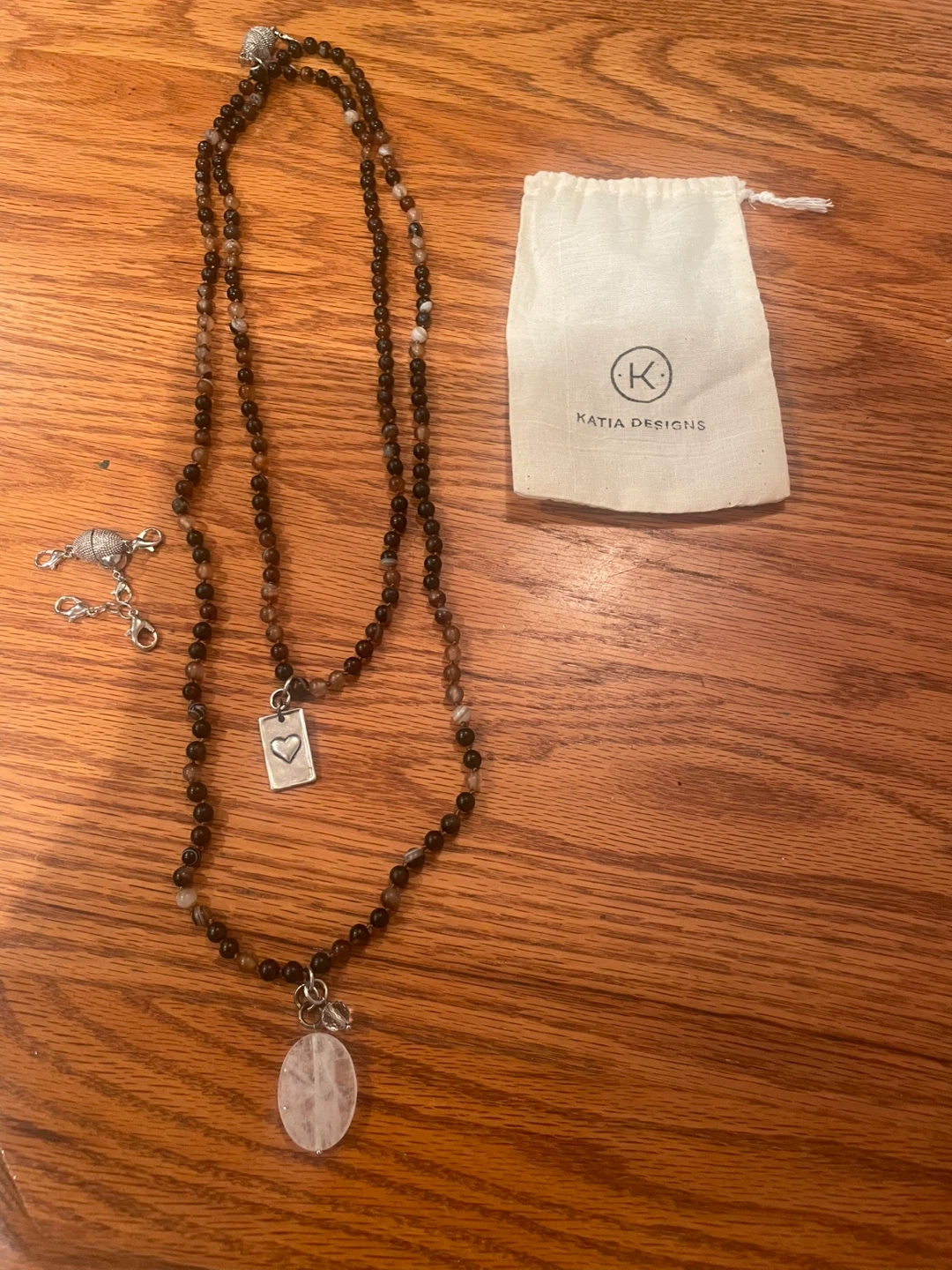 This Katia Designs necklace features a beaded chain with a heart charm and a natural stone pendant. It comes with a small drawstring pouch for storage. The clasp is magnetic for easy wear.