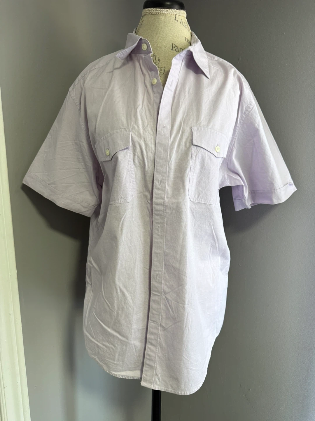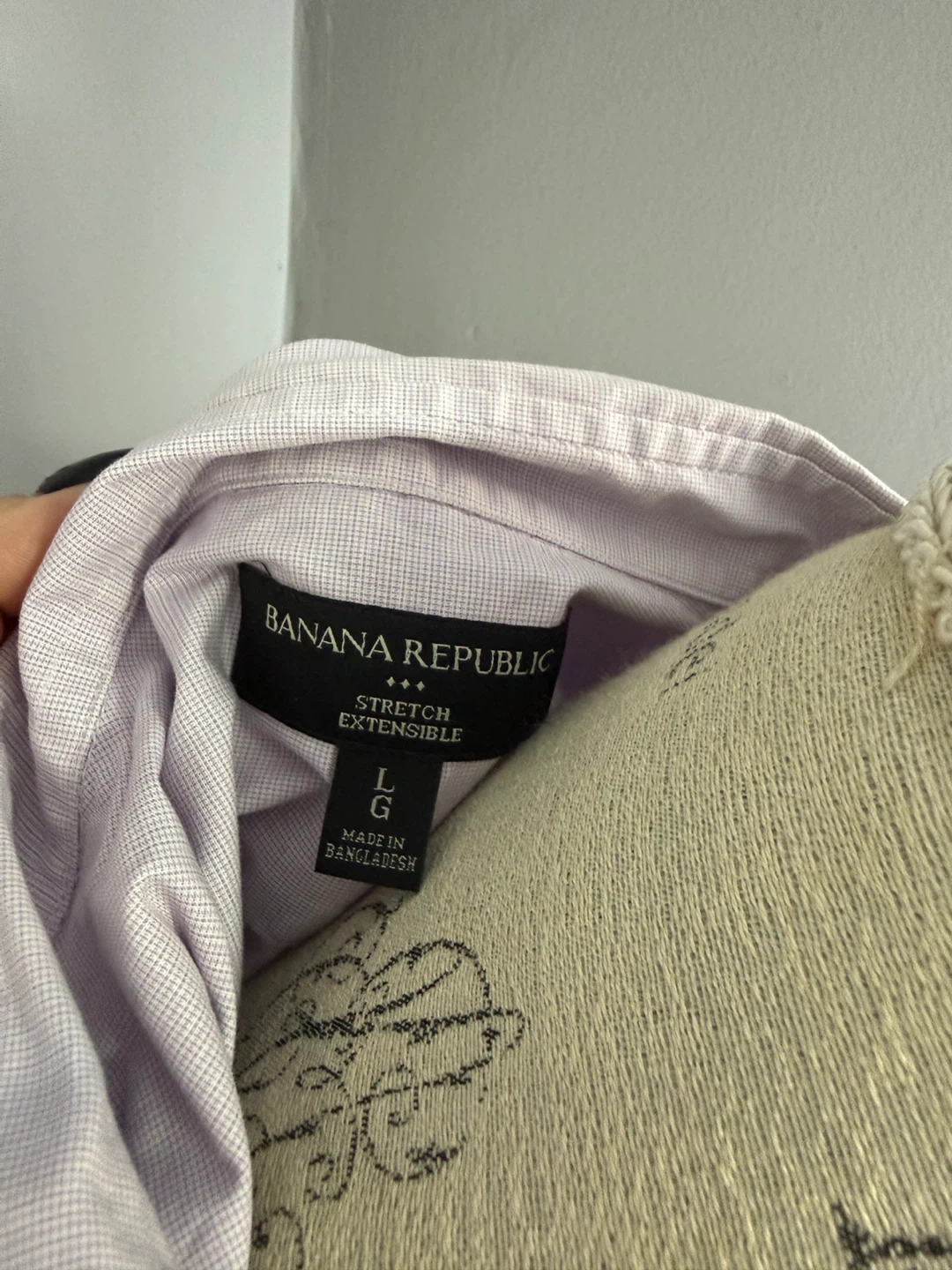 This Banana Republic men's short sleeve shirt is size large. It's made with a stretch extensible fabric for comfort. It has a button-up front with two chest pockets.