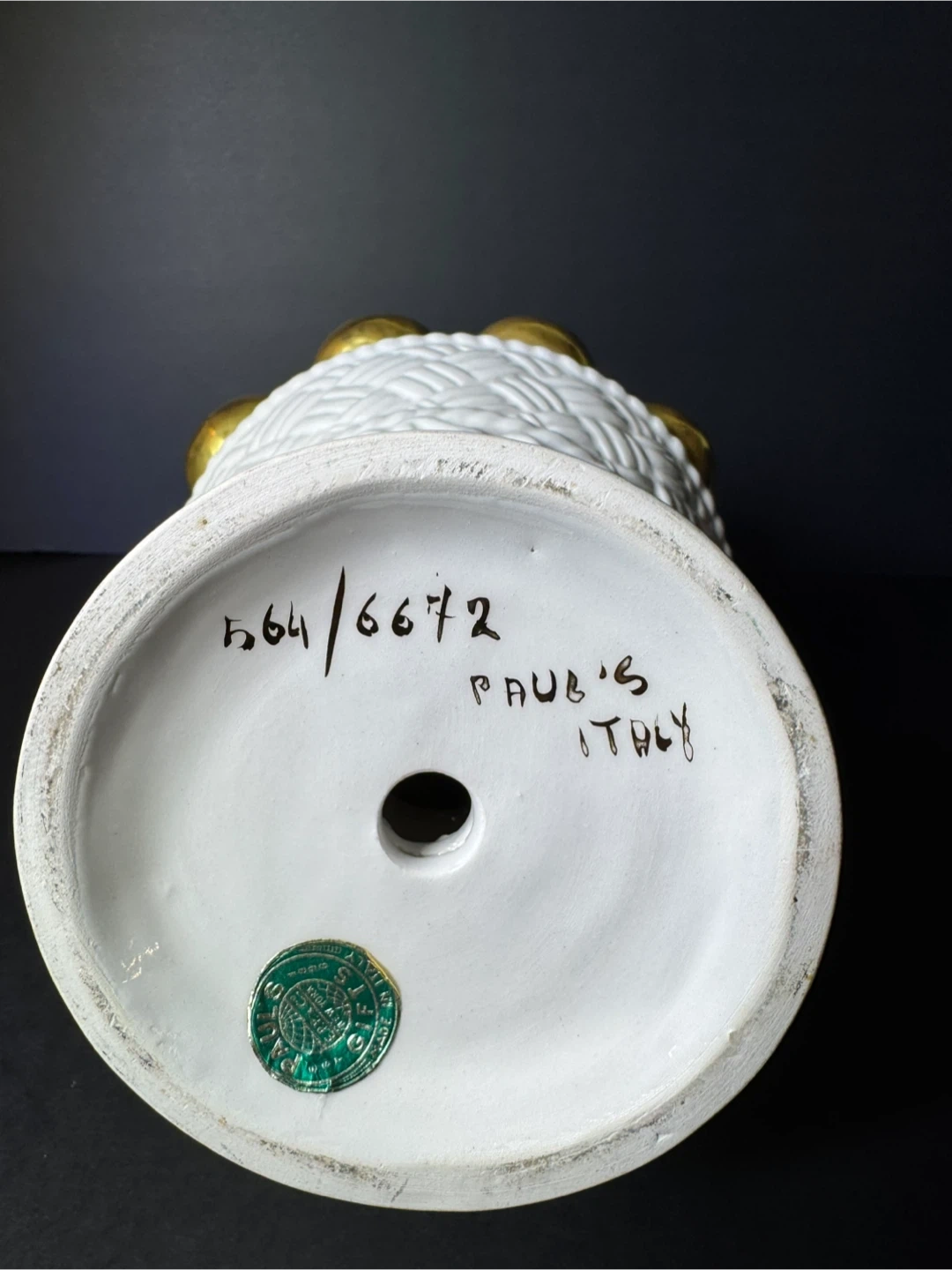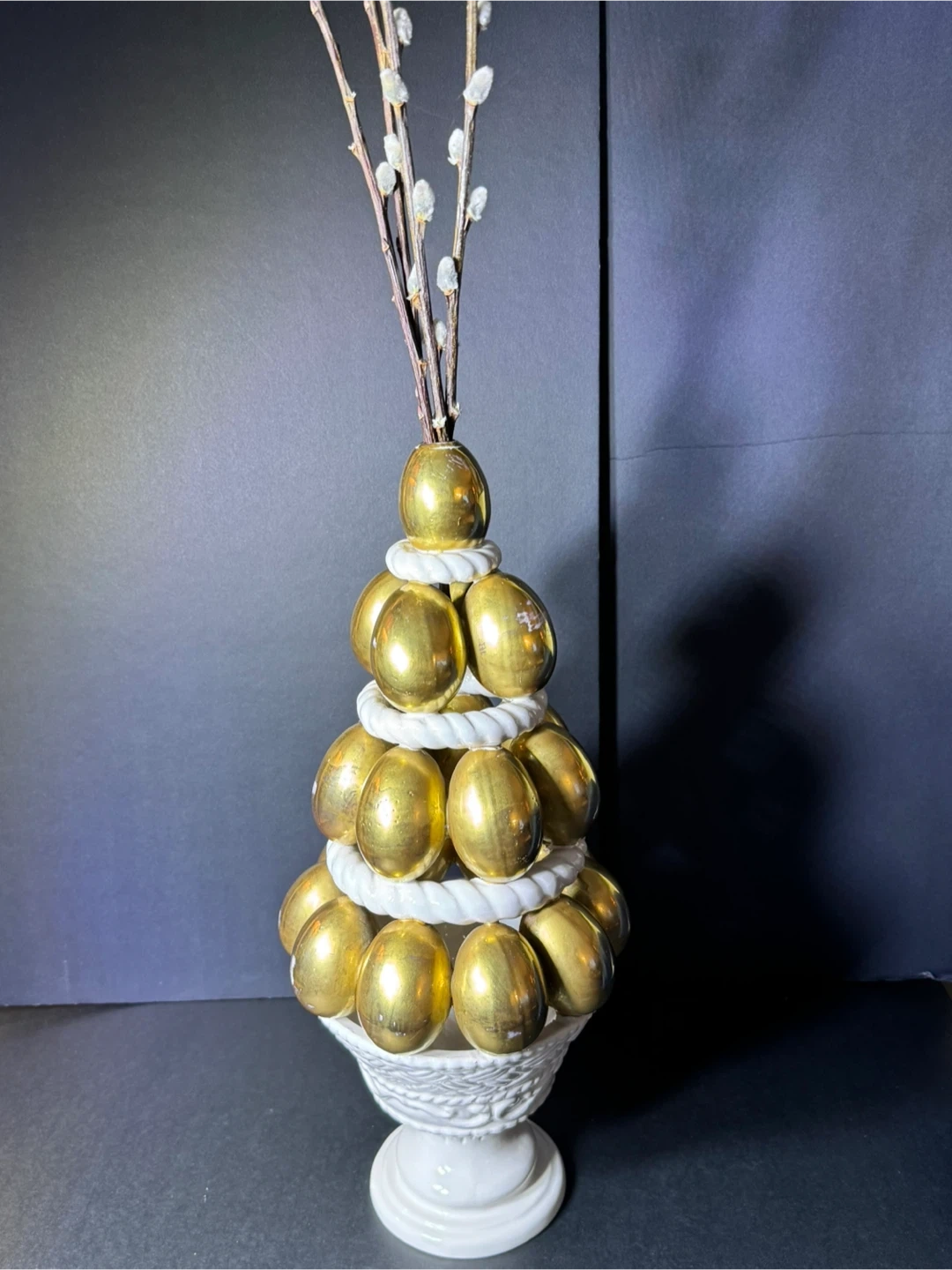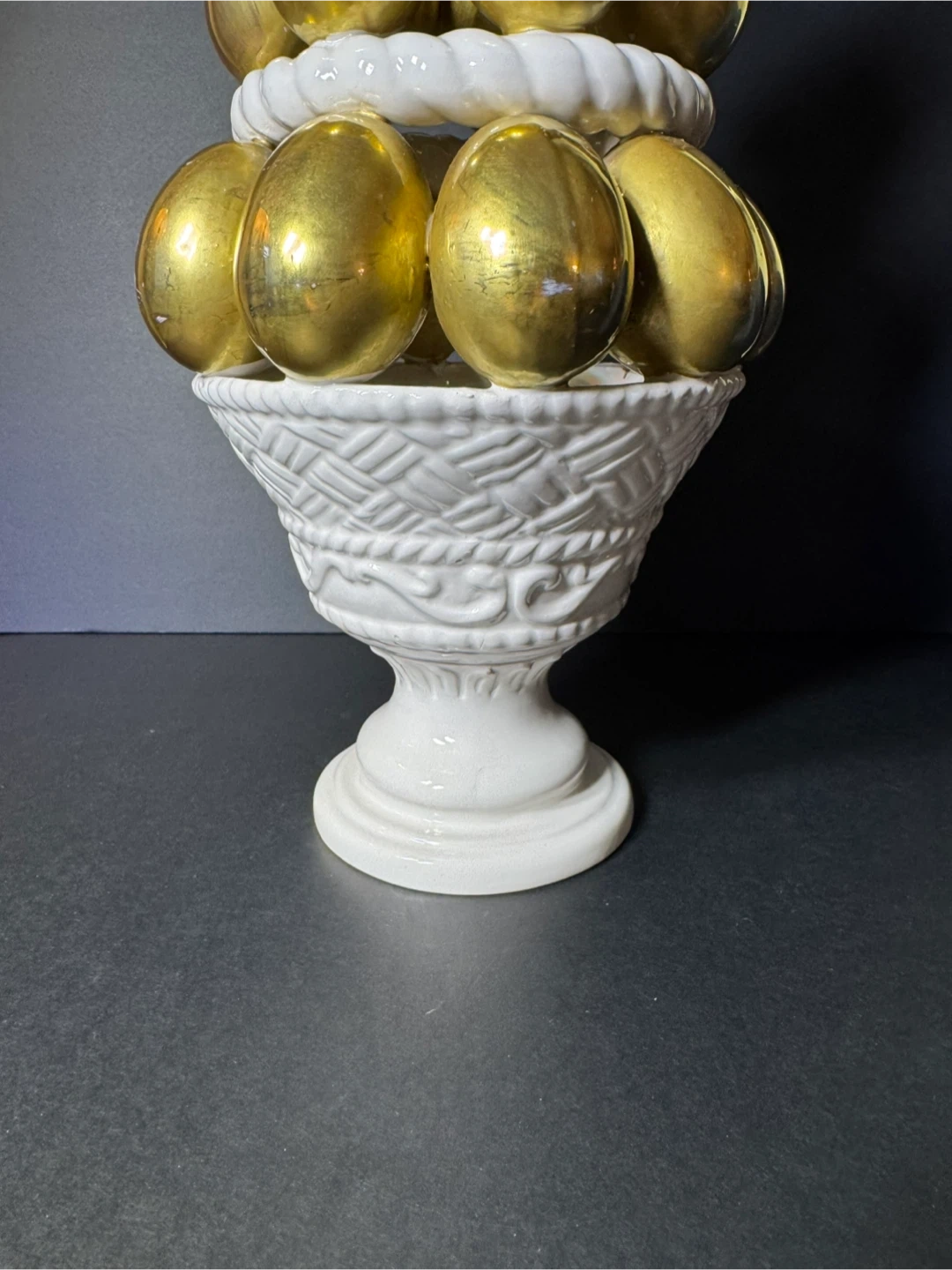 This vintage decorative piece features a white ceramic base and a tiered arrangement of golden eggs, accented with white rope detailing. It's a unique decorative item that adds a touch of elegance to any space. The base is marked "Paul's Italy" and includes a model number 564/16672. This piece is perfect for display during spring or holiday seasons.High 17 inches