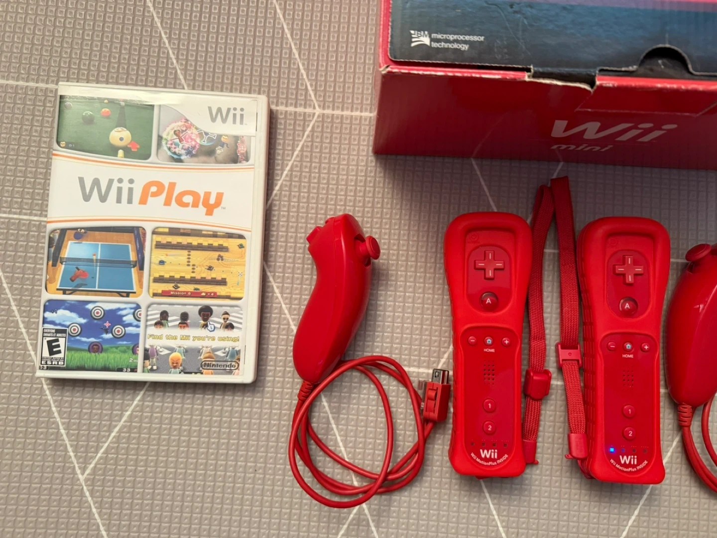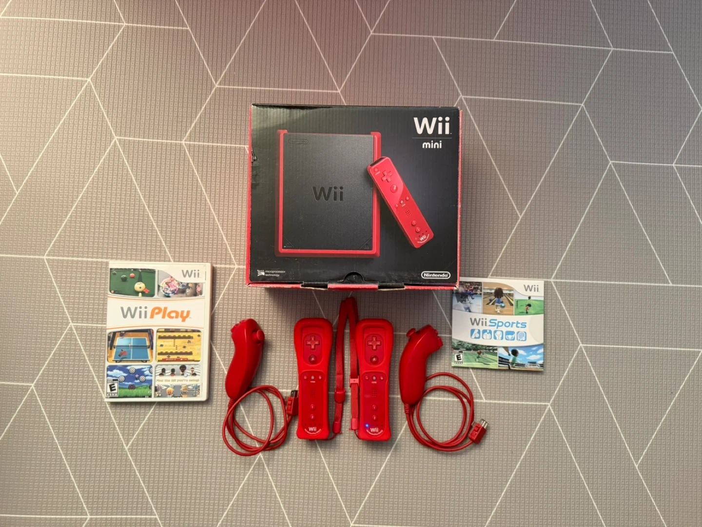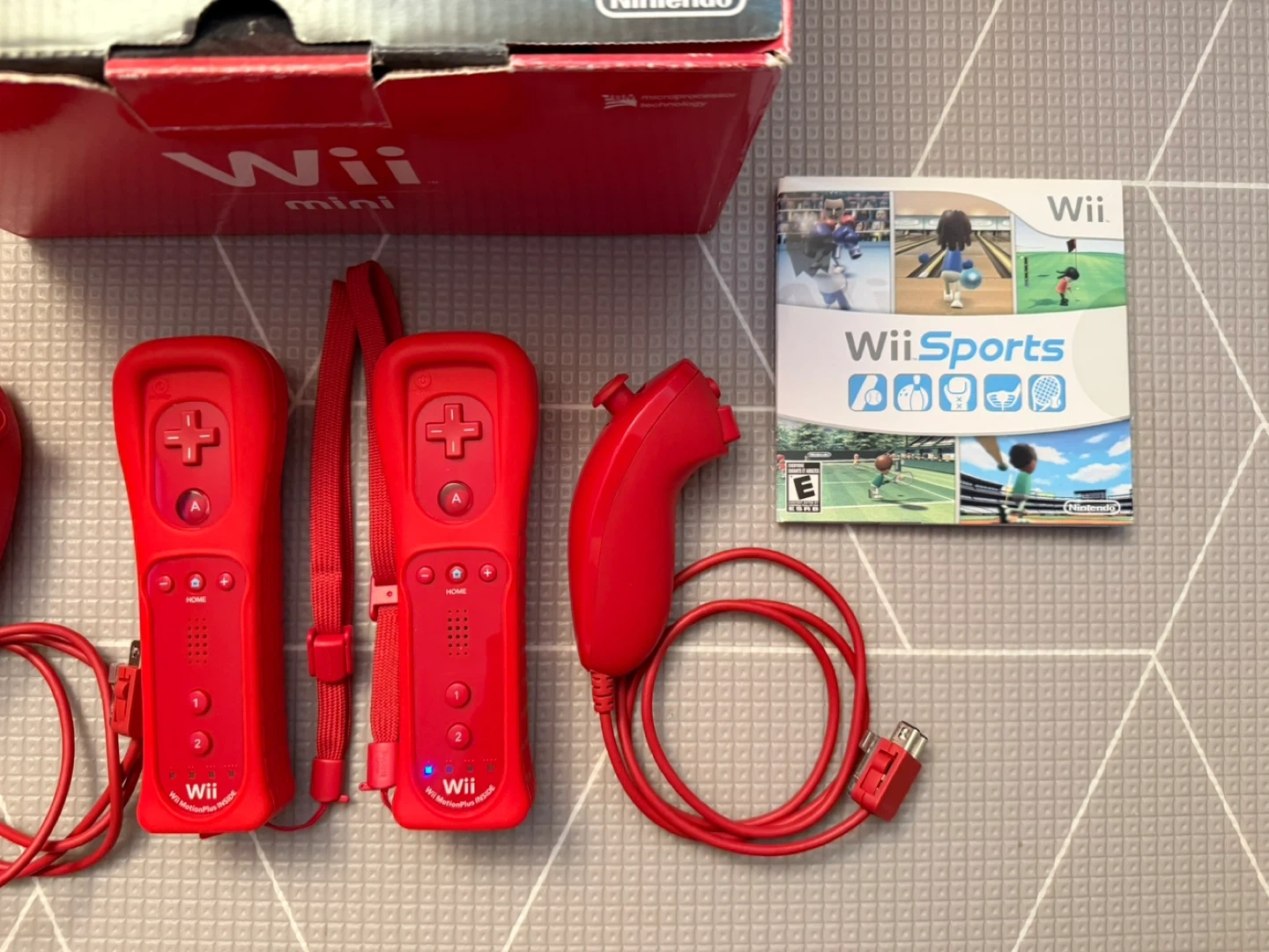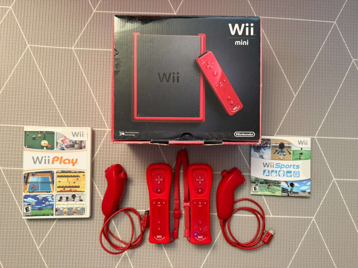 Included: Wii Mini, 2 Controllers, 2 Nunchucks, 2 Controller Cases, Wii Sports, Wii Play, Original Box, Sensor, Power Cord, HDMI Adapter.