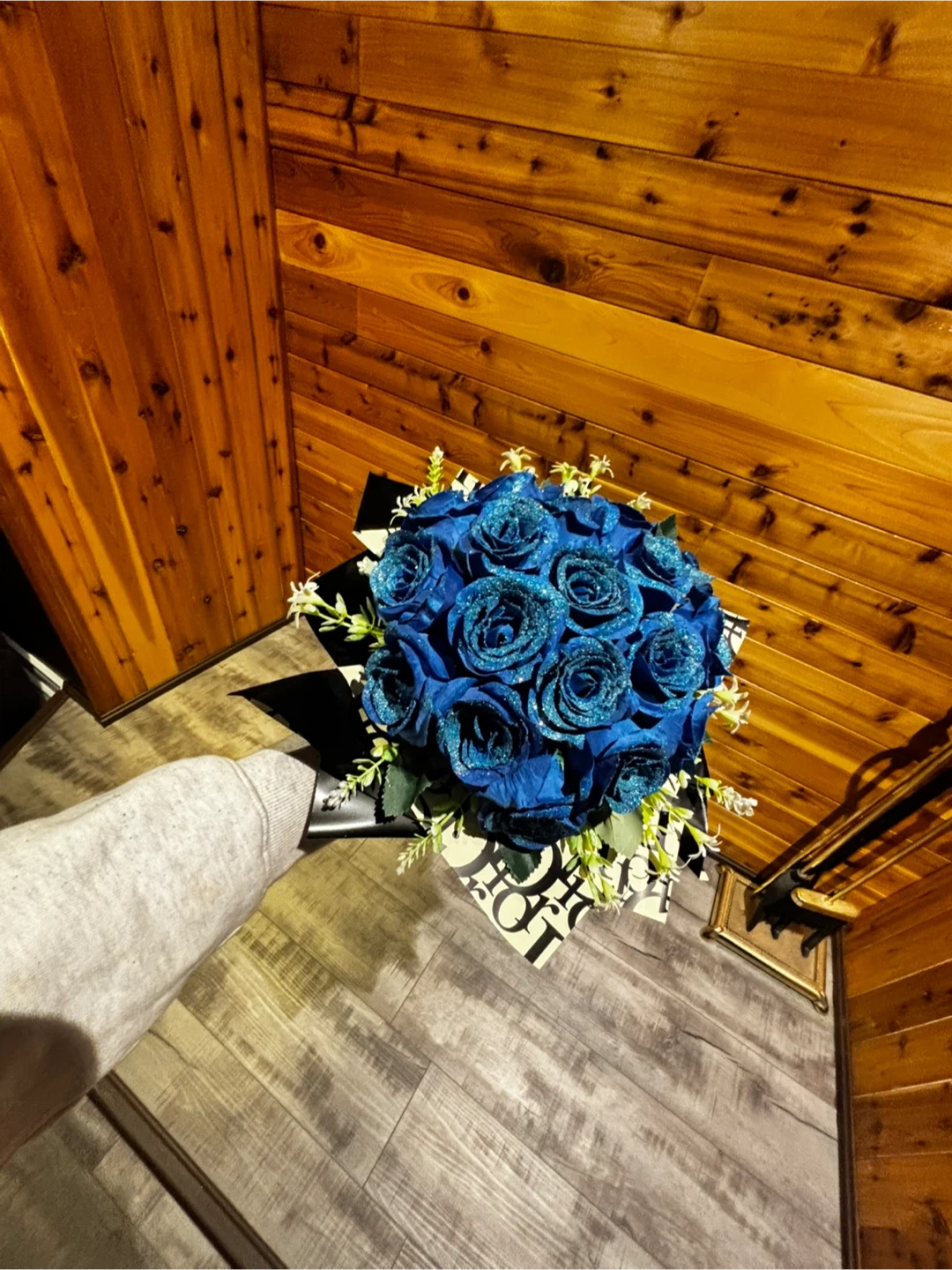 A beautiful bouquet of deep blue roses, each with a sparkly glitter finish. They're accented with delicate white sprigs and greenery. This arrangement is perfect for adding a touch of elegance to any room or for a special occasion.
