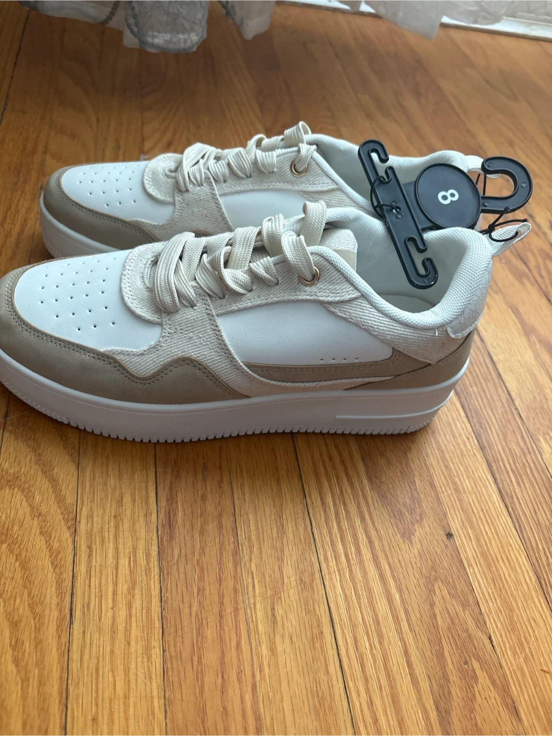 Brand new white and tan lace-up sneakers. Comfortable and stylish design, perfect for everyday wear. Size is 8.