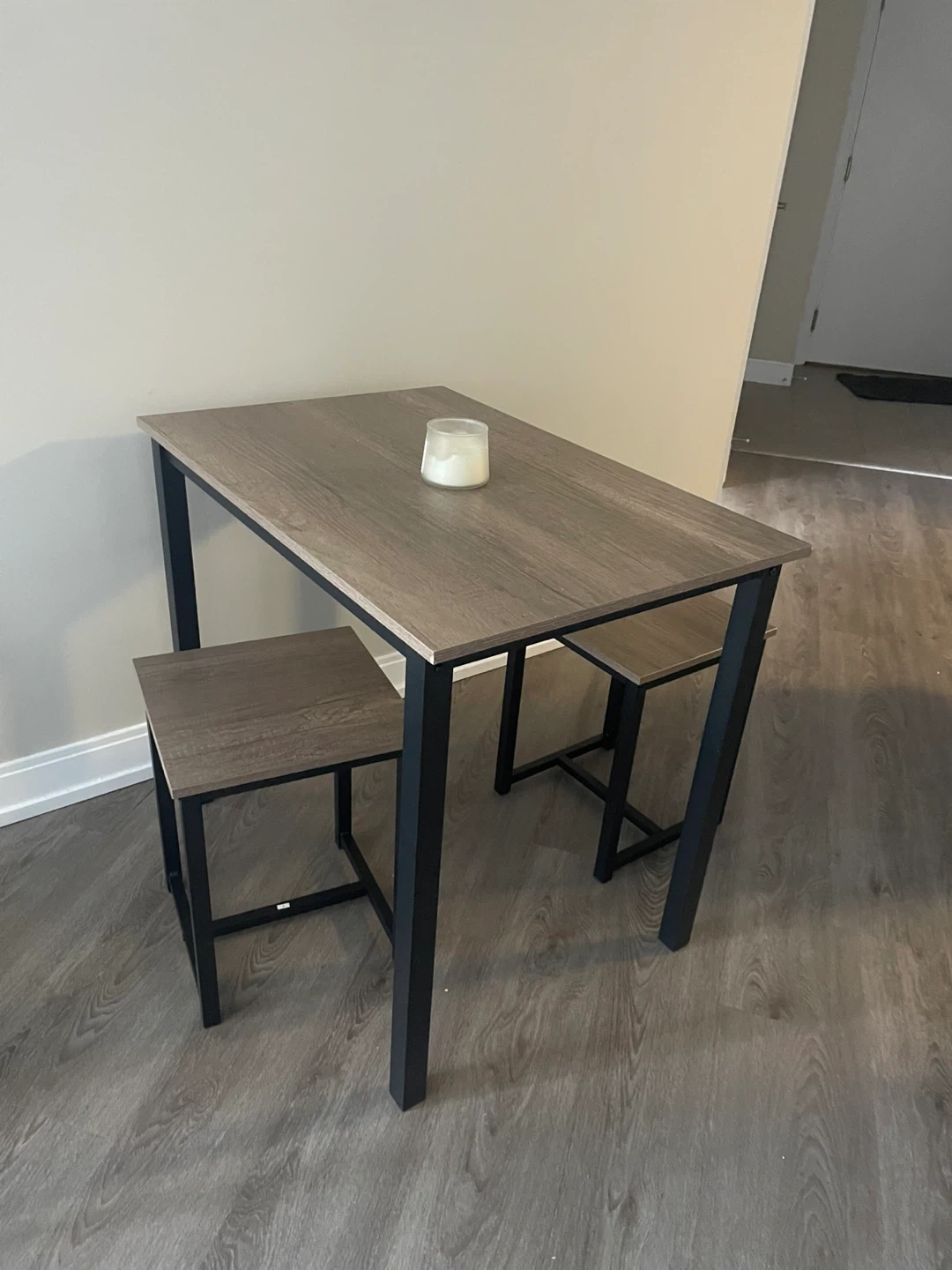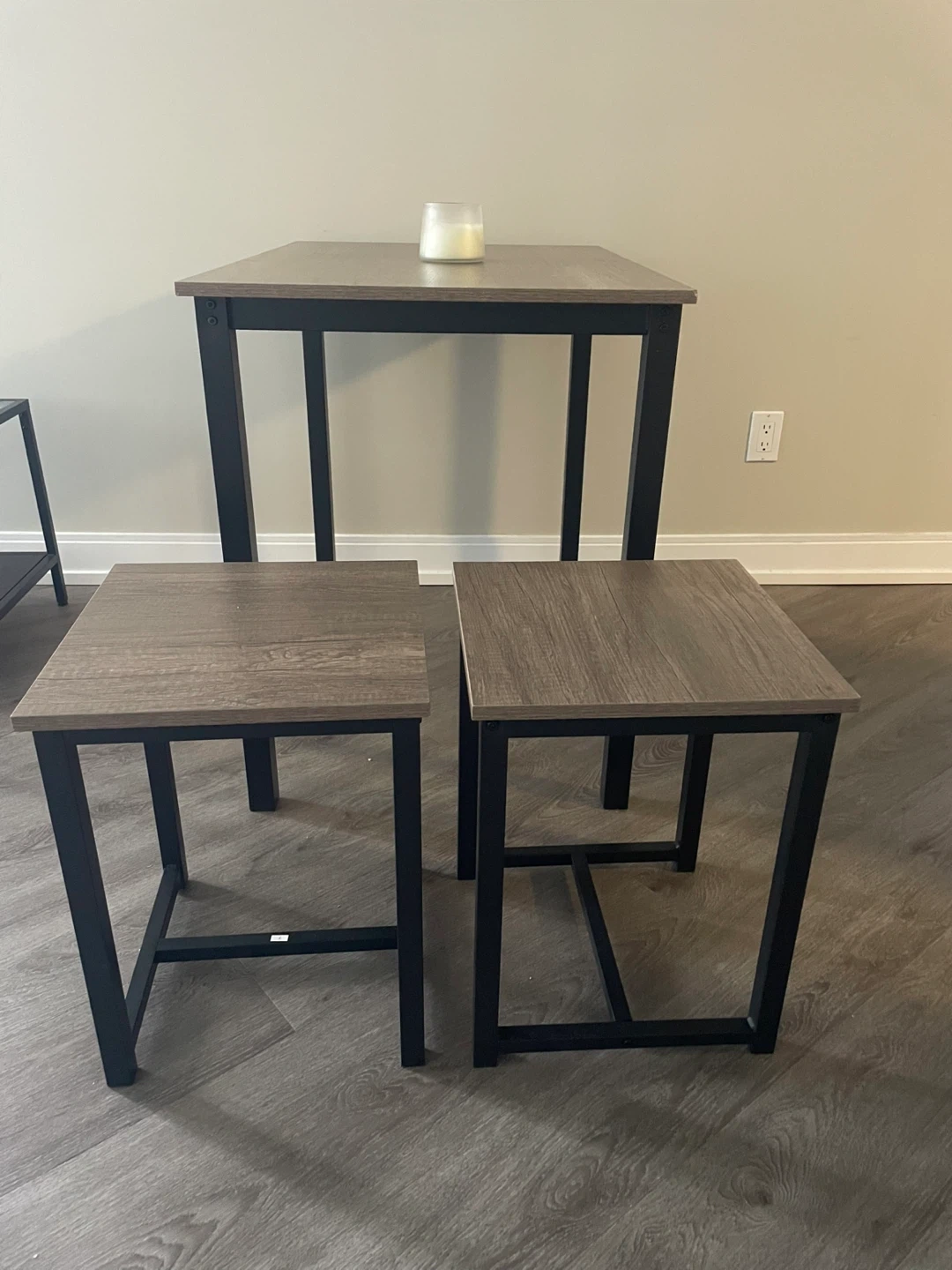 This compact dining set includes a table and two stools. It features a wood-look tabletop with a black metal frame. Perfect for smaller spaces or as a breakfast nook set!