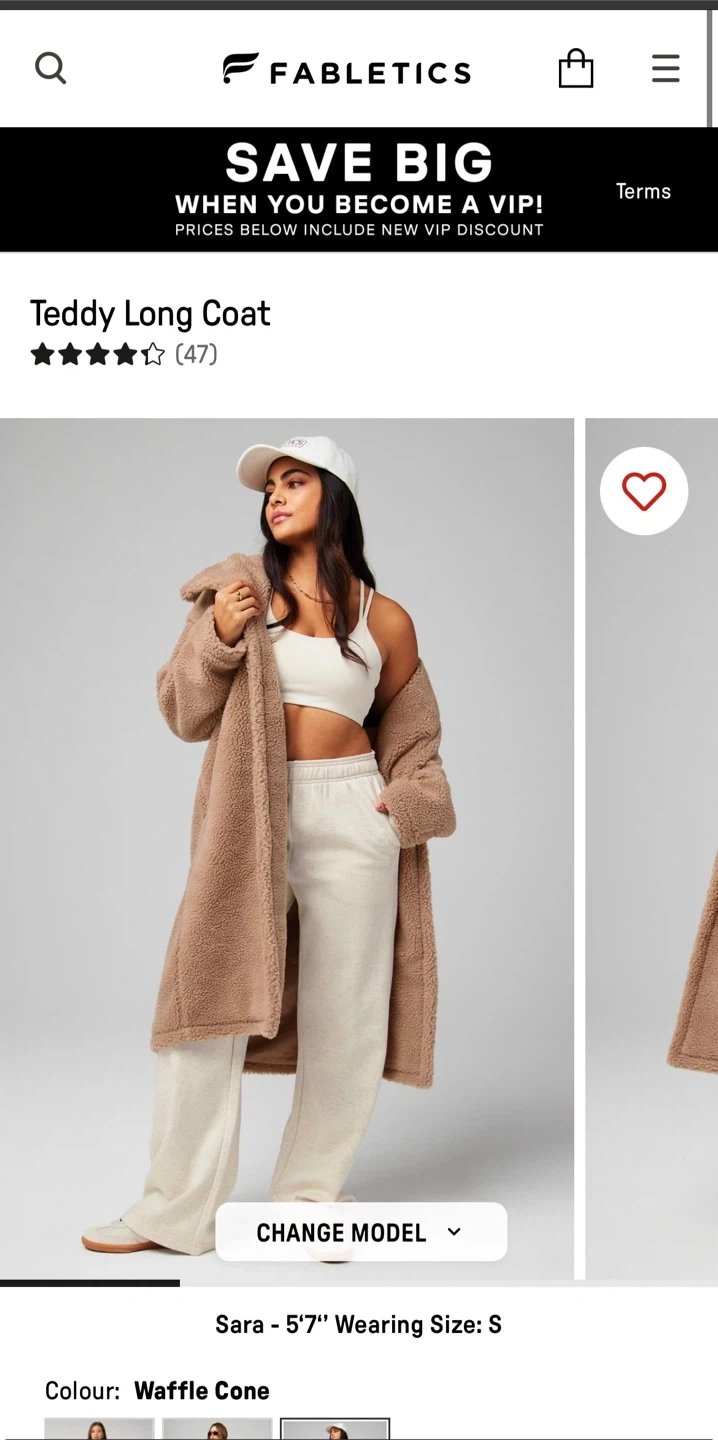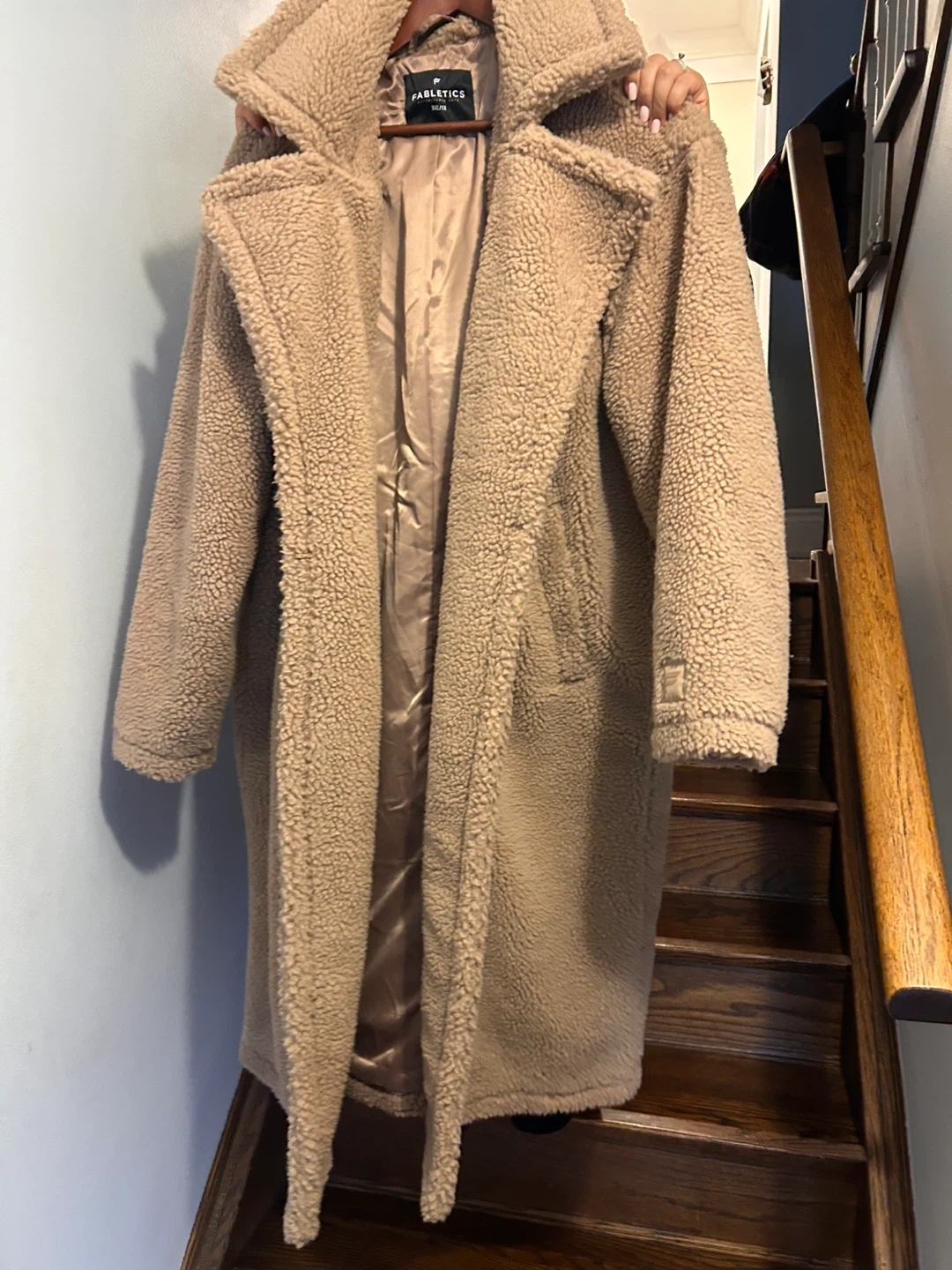 Cozy Fabletics teddy long coat in a warm Waffle Cone colour. This plush coat is perfect for staying warm on chilly days. It features a longline silhouette and a soft, sherpa-like exterior.
