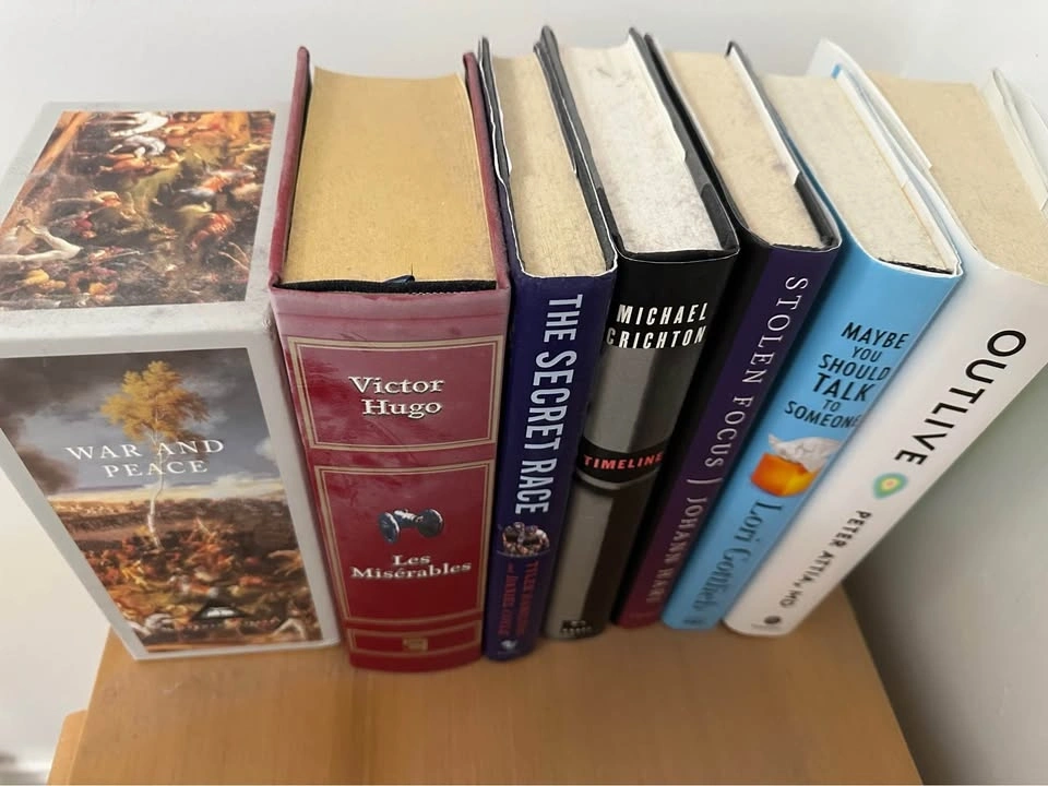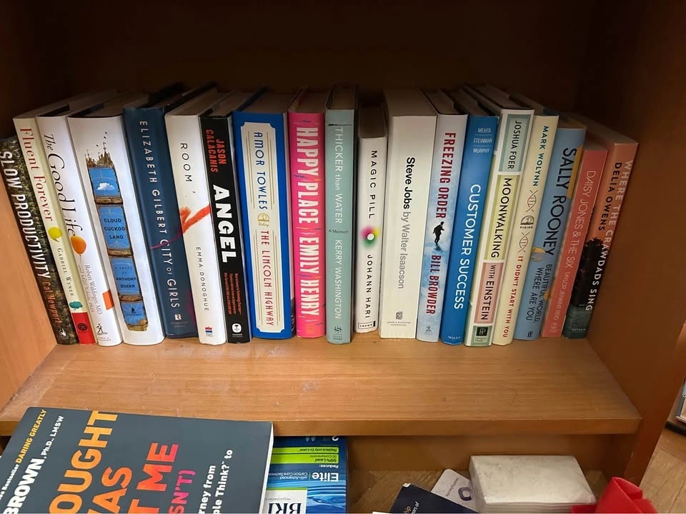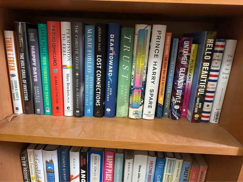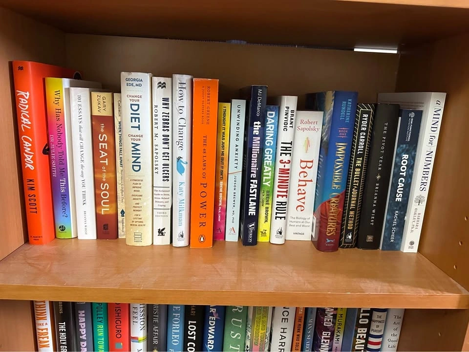 Diverse collection of modern hardcover and paperback books. Selection includes popular self-help, psychology, memoir, and contemporary fiction titles. Spines are intact with no visible damage or heavy wear. Most books are standard trade sizes with clean covers and pages.