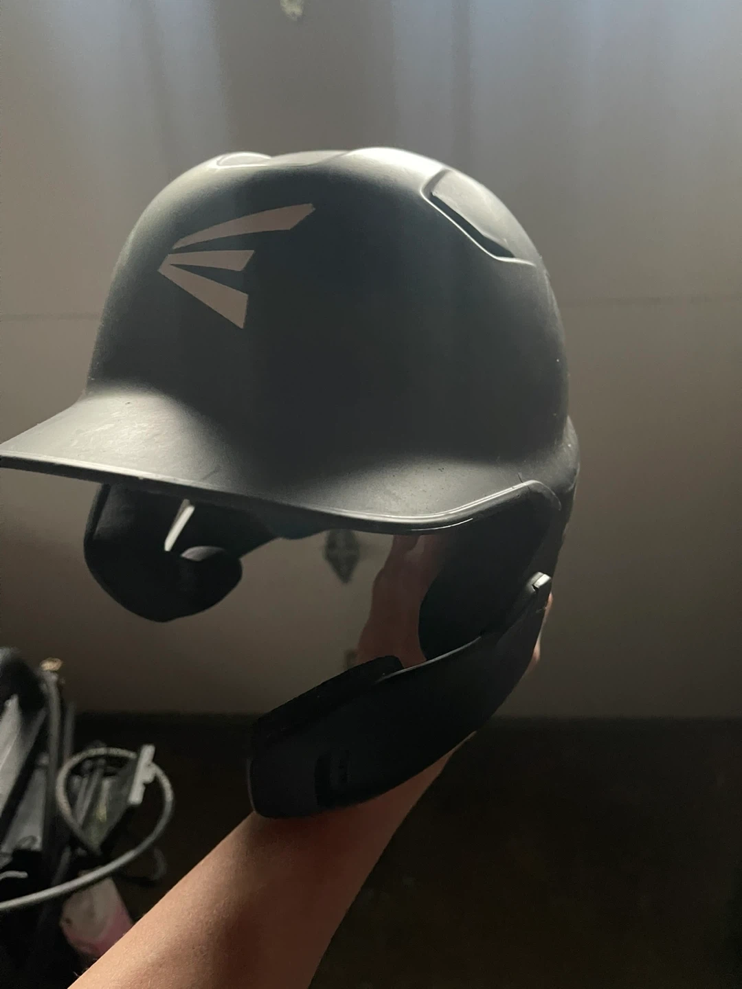This is an Easton batting helmet designed for baseball. It's black and includes ear guards for protection. It's suitable for players needing head protection during games or practice.