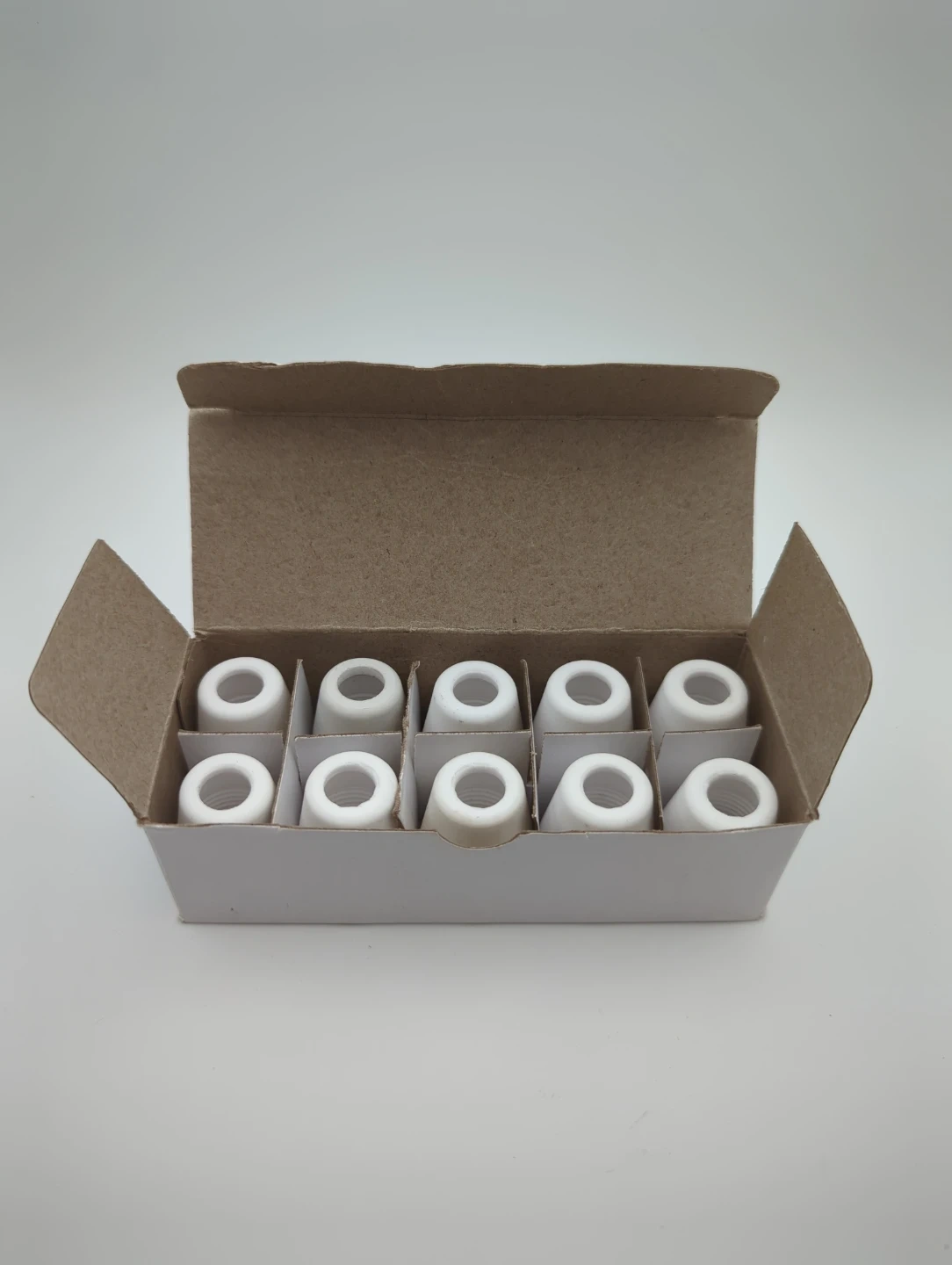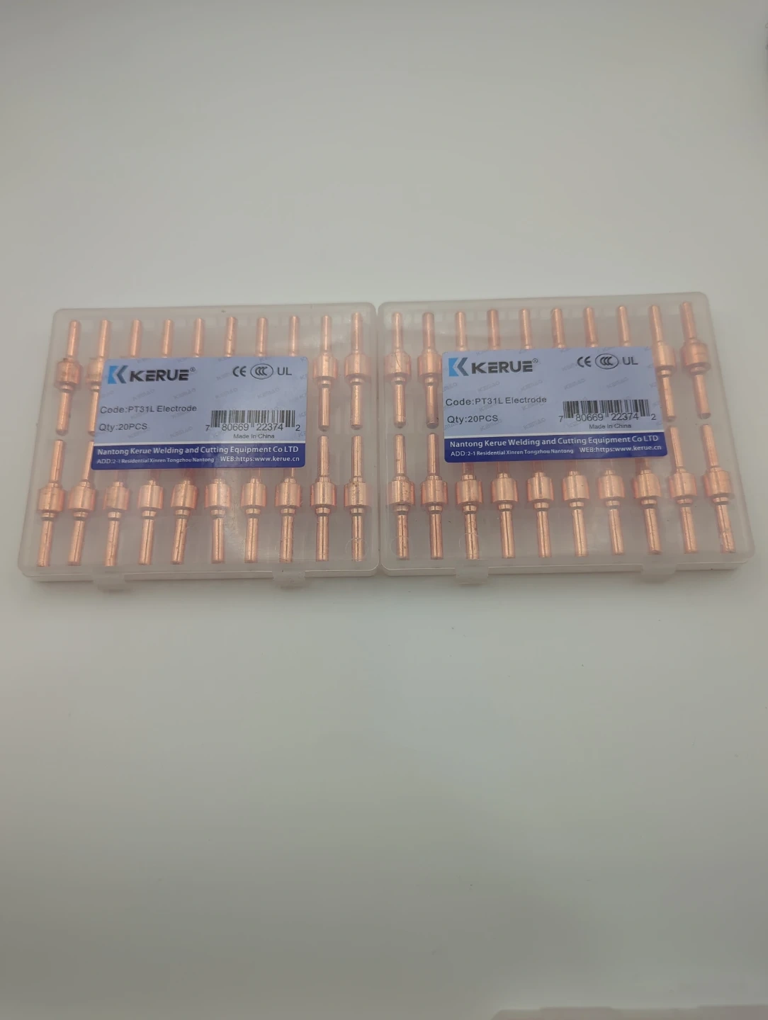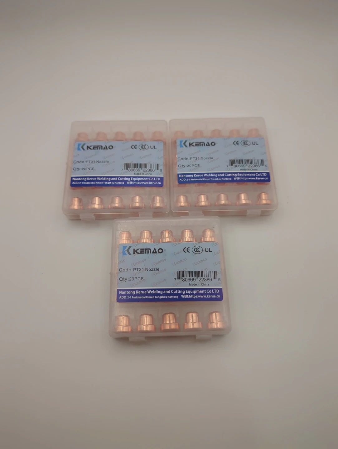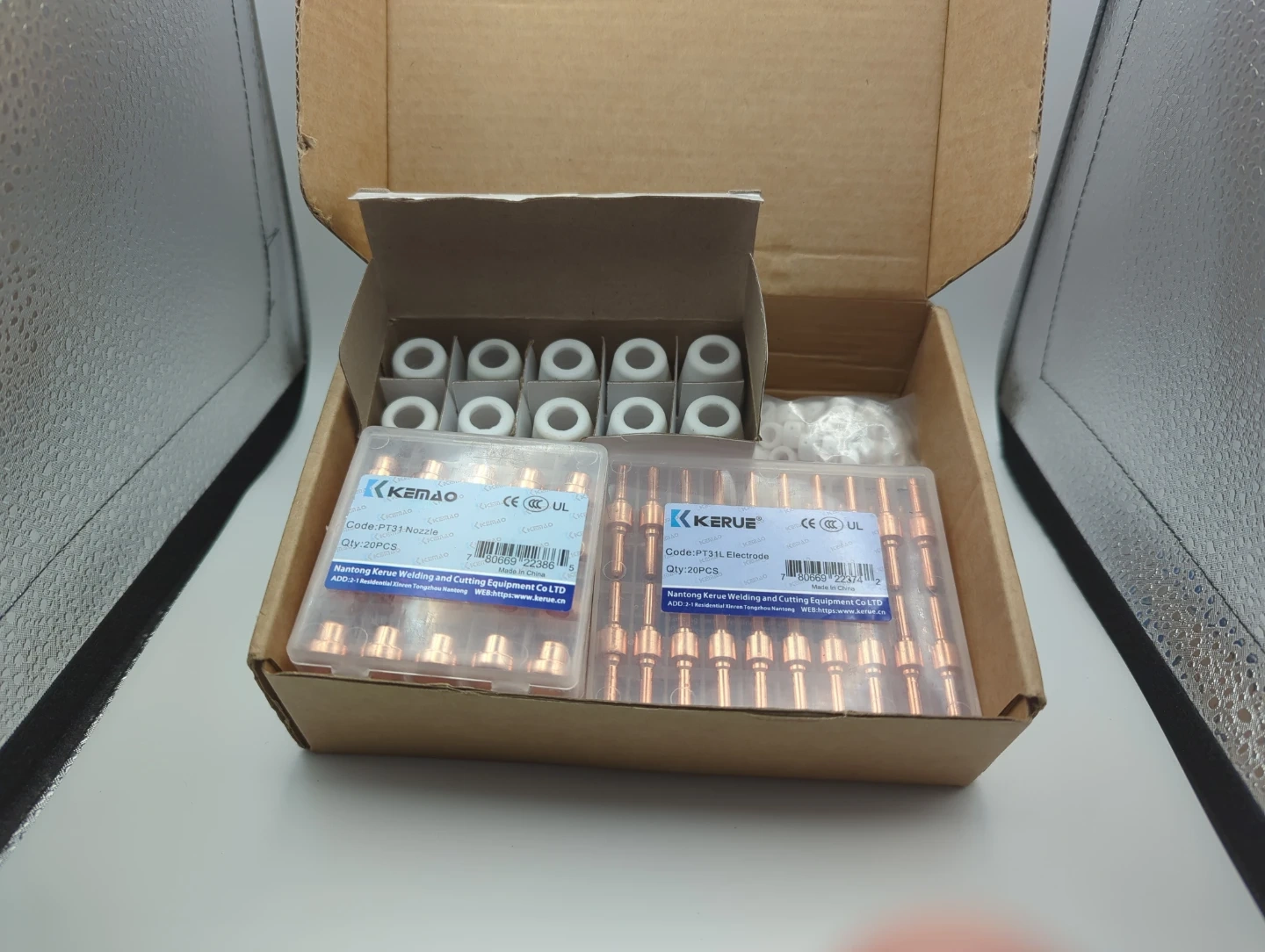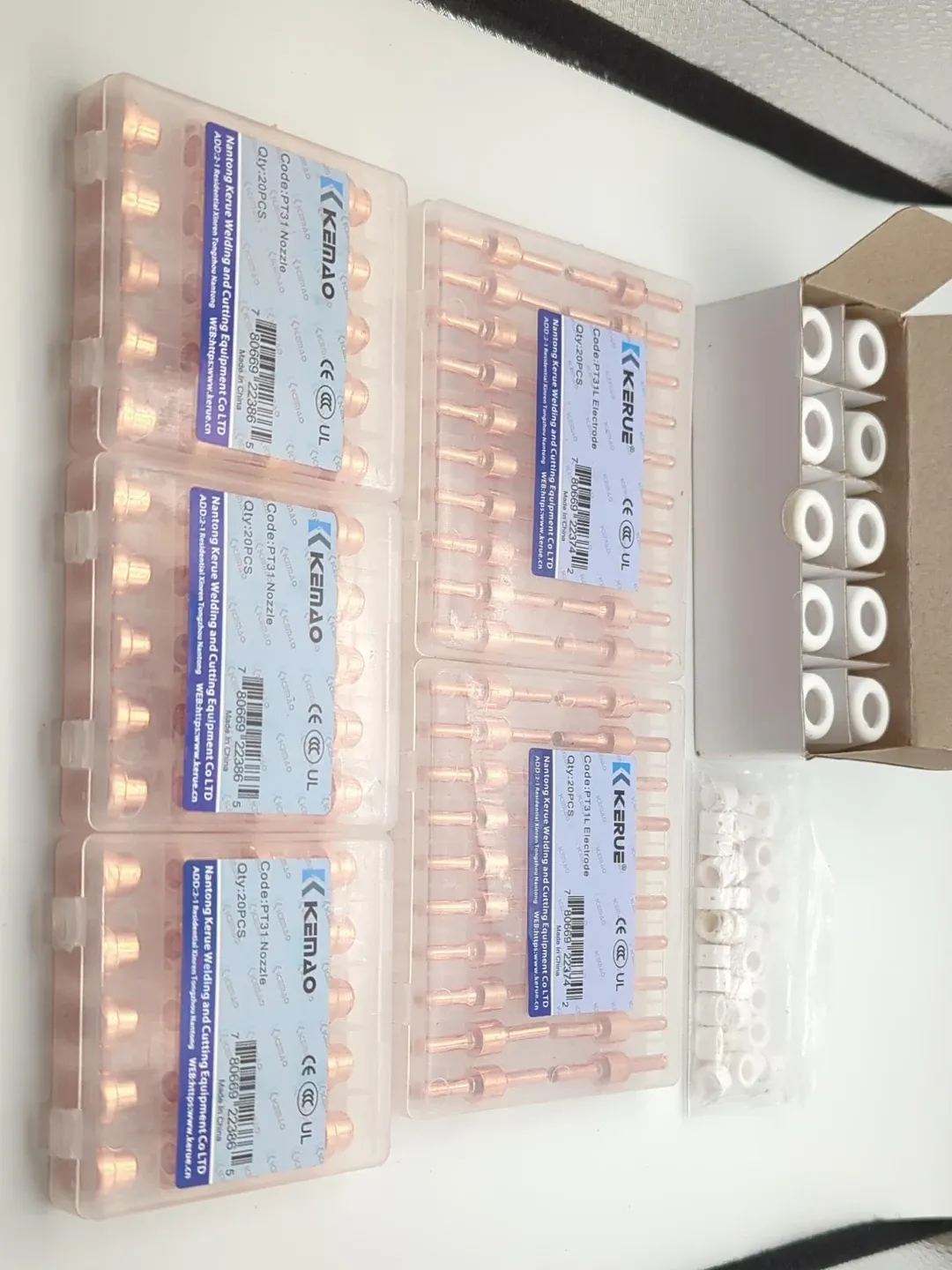 Lot includes KEMAO PT31 Nozzle, KERUE PT31L Electrode plasma cutter consumables and High Grade Ceramic Shield-Cups and Swirl-Rings. Kit contains 60 Nozzles, 40 Electrodes, 10 Shield-cups and 40 Swirl-Rings. Total of 150 pieces. These are replacement parts for plasma cutting machines.