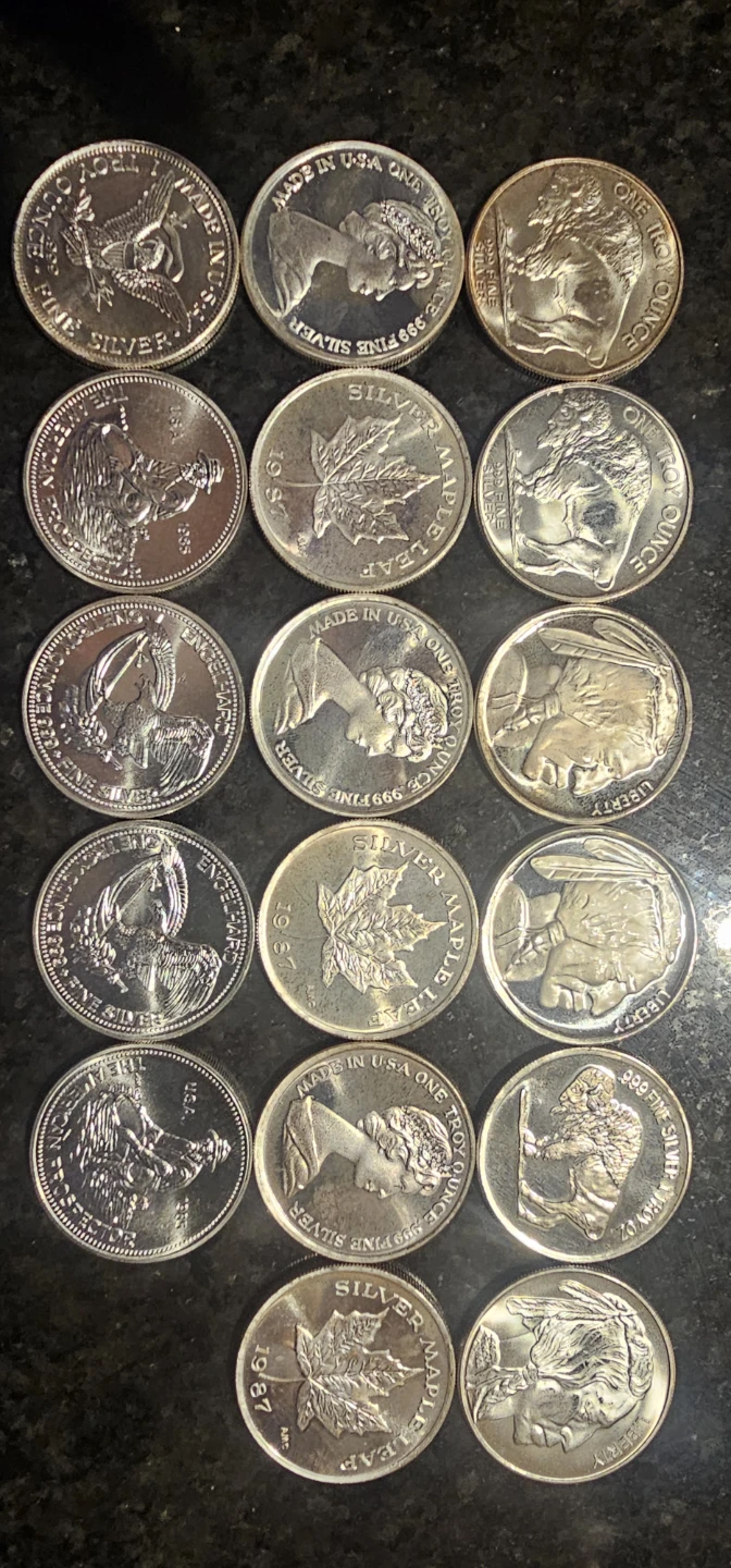 I have for sale 17 Silver Rounds in great shape. I personally purchased these in 1987 from Gervais coins so I know they are all authentic.I am selling at market value at $140 each which works out to $2380 for the lot of 17. This is based on comparable current sales and $130 spot price Golden State Mint has posted their shipments are delayed due to High demand,however,I have these in hand and can be yours today.Thanks for looking.