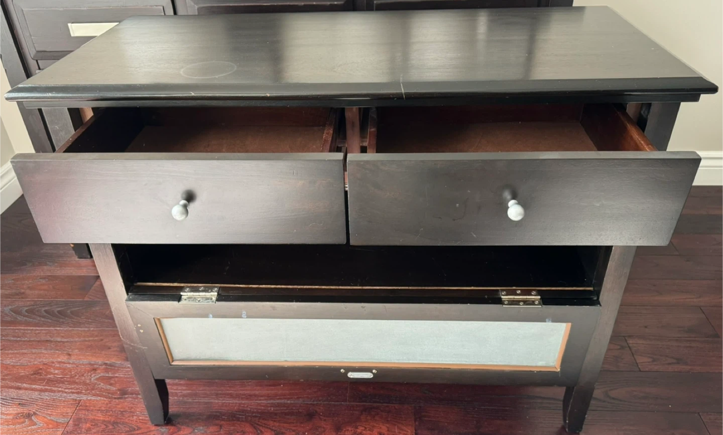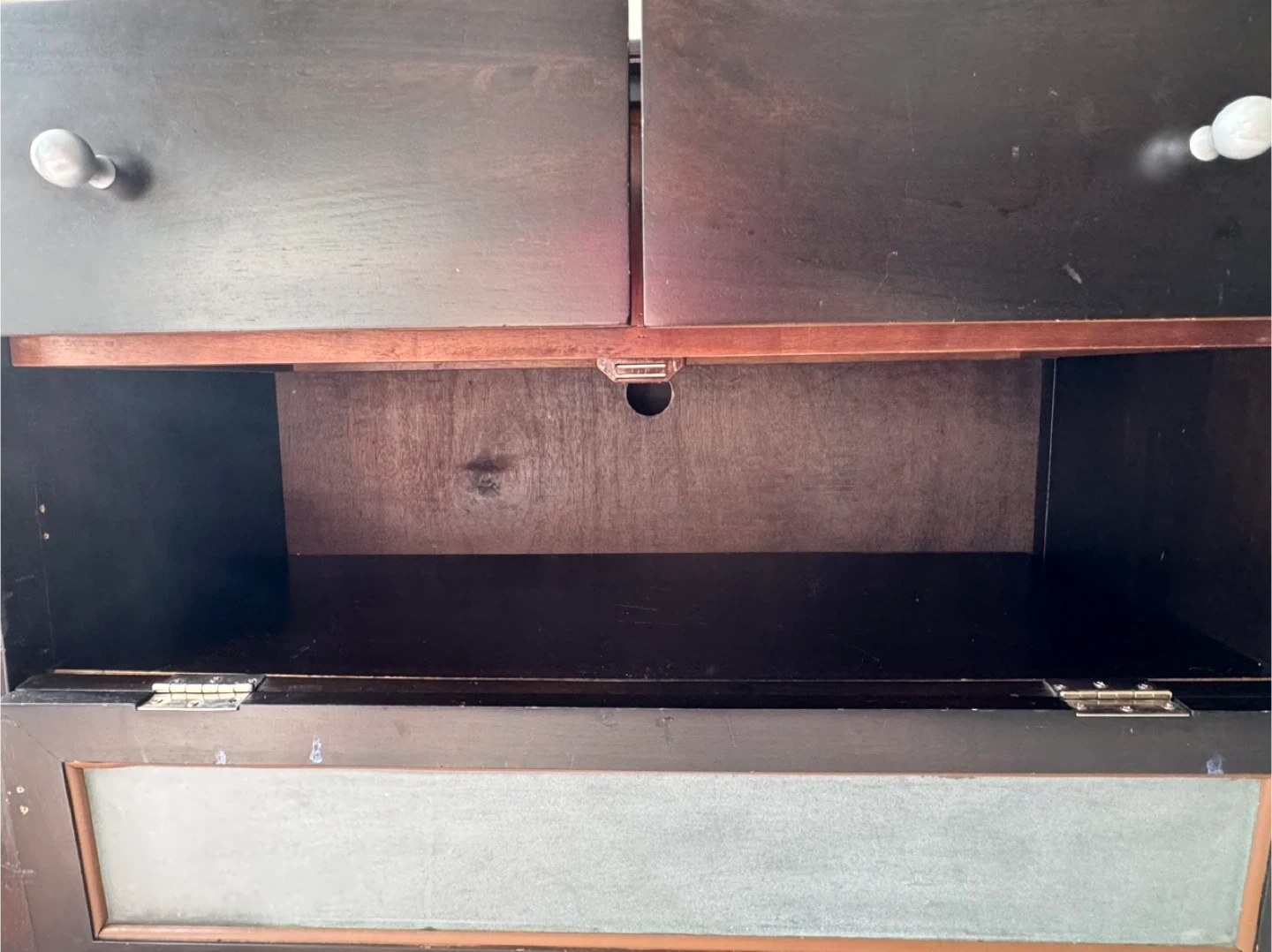 Wood and glass with metal handles
