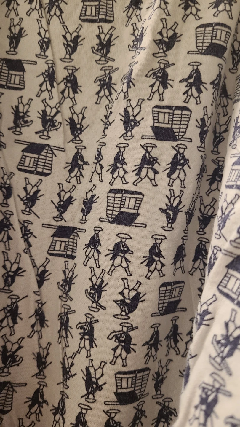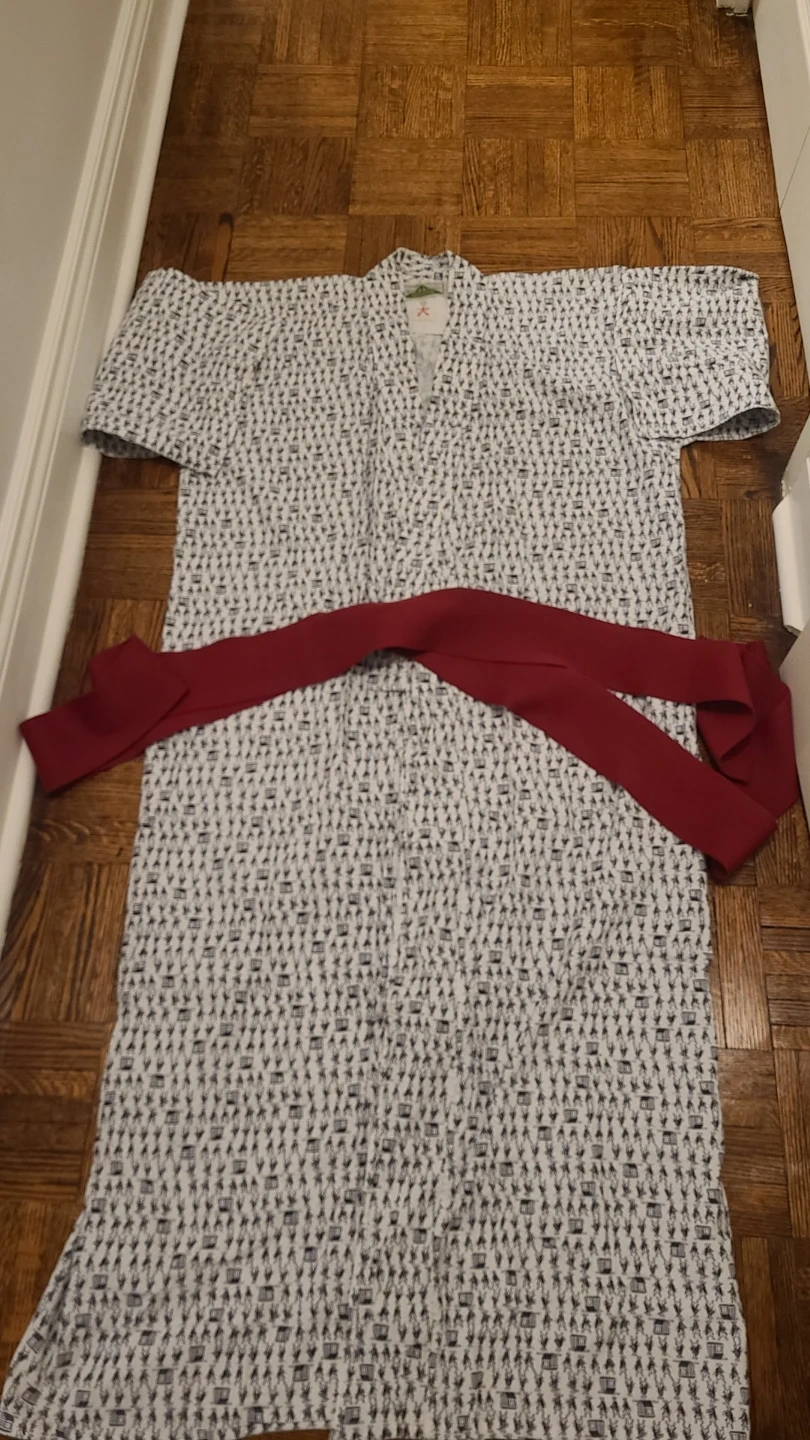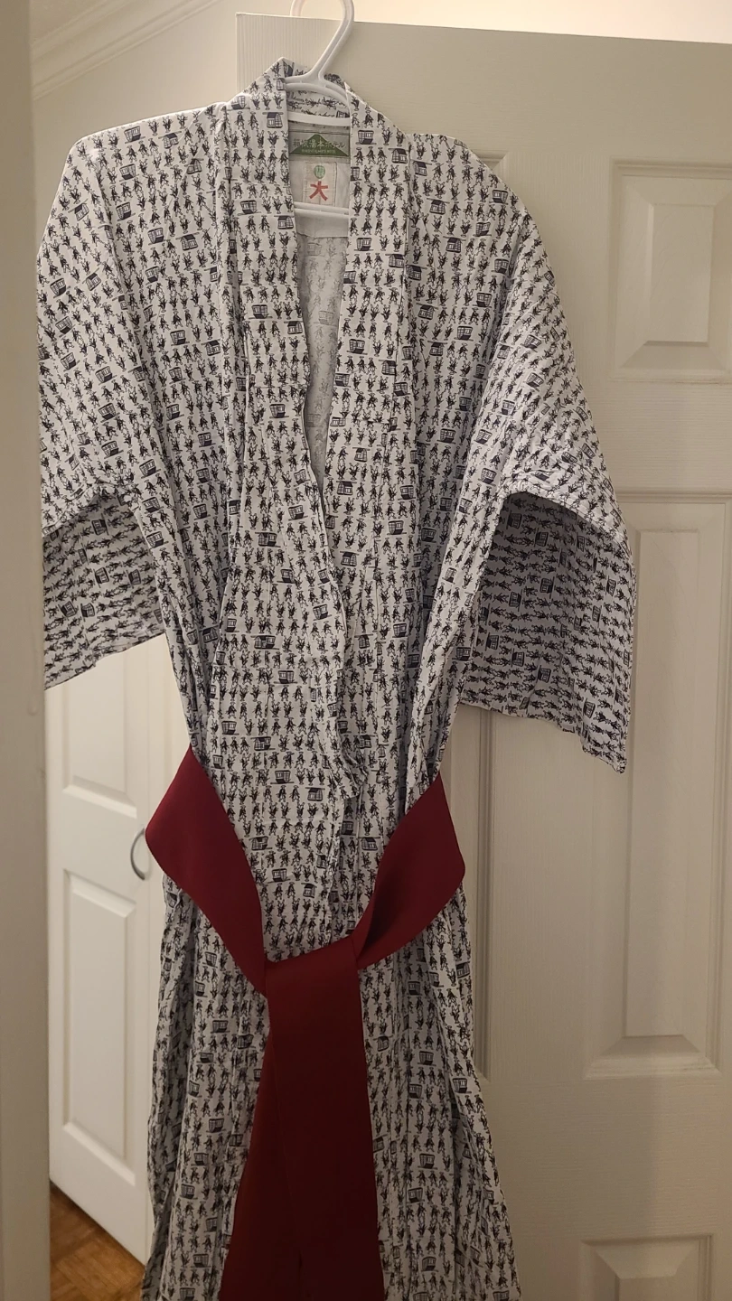 This is a traditional Japanese Kimono with a unique historical pattern. It comes with a matching red sash. Lightweight and comfortable for lounging.