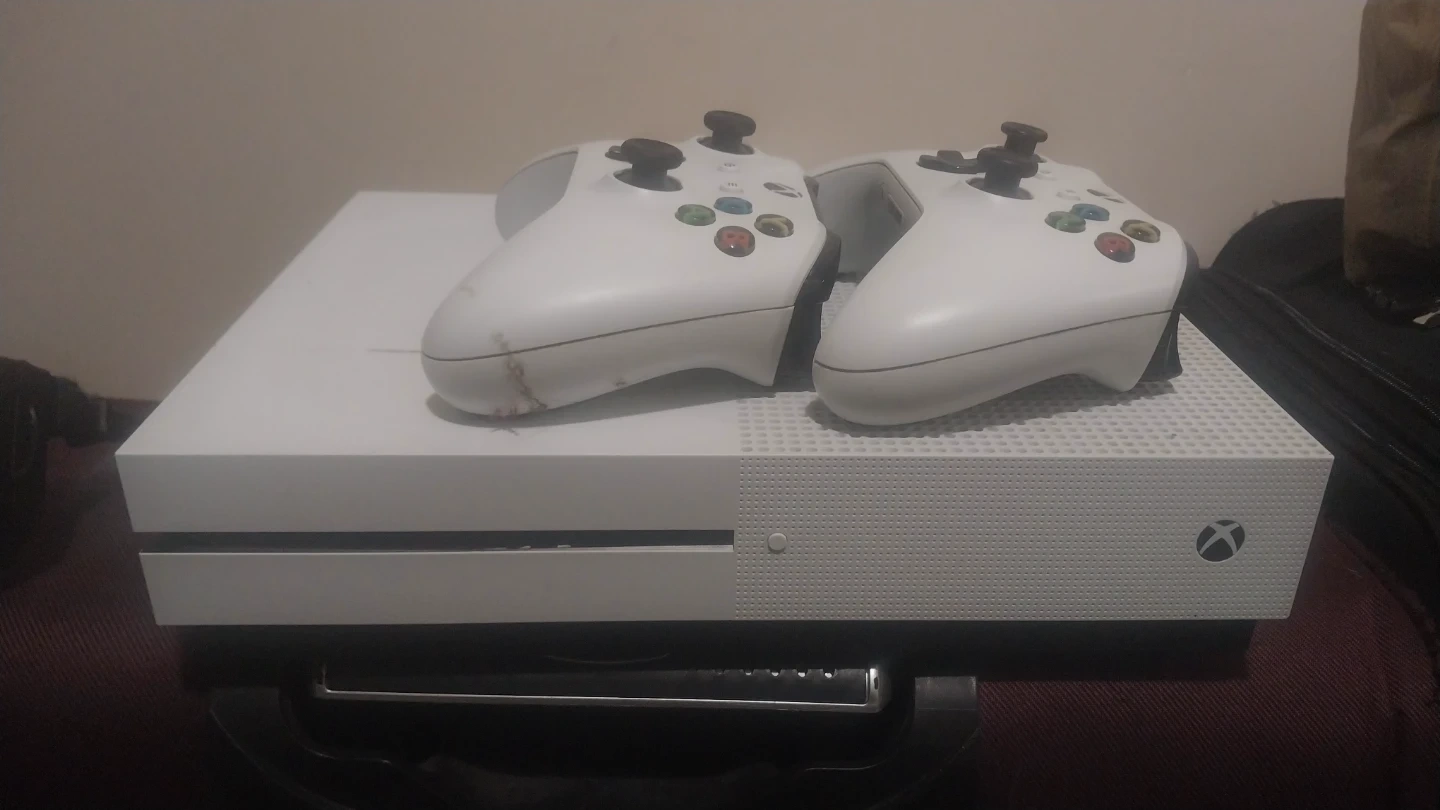 This is a white Xbox One S console. It comes with two white wireless controllers. Perfect for multiplayer gaming!