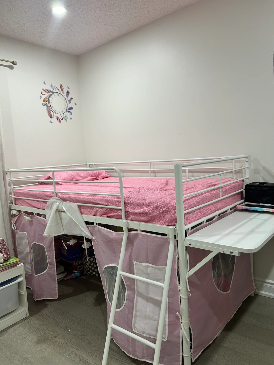 Selling an IKEA Småstad loft bed frame with a desk in excellent condition! This is perfect for a kid's room to save space and create a fun area for both sleep and study. The bed is white with pink accents, and the desk provides a handy surface for homework or creative projects. The ladder makes it easy to climb up to the cozy sleeping space! The bed also features a curtain to create a private space.