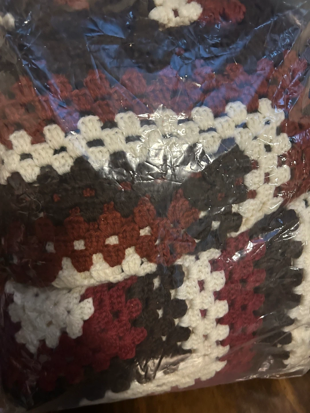 Cozy crocheted afghan blanket in shades of white, burgundy, and brown. Perfect for adding a warm touch to your home. It’s been stored awhile will need dry cleaning priced to sell 5.00 for both.